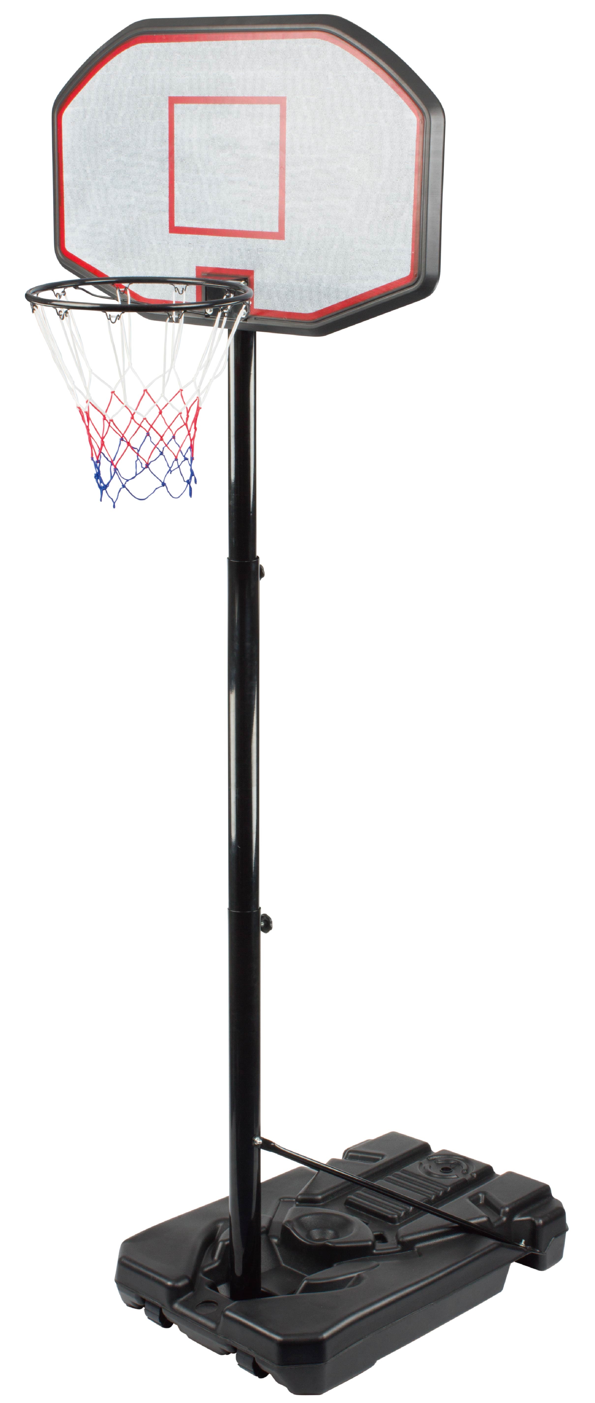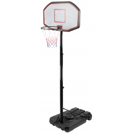 Mobilný basketbalový kôš s nastaviteľnou výškou, pevnou plastovou hornou časťou a sieťovým okrajom.