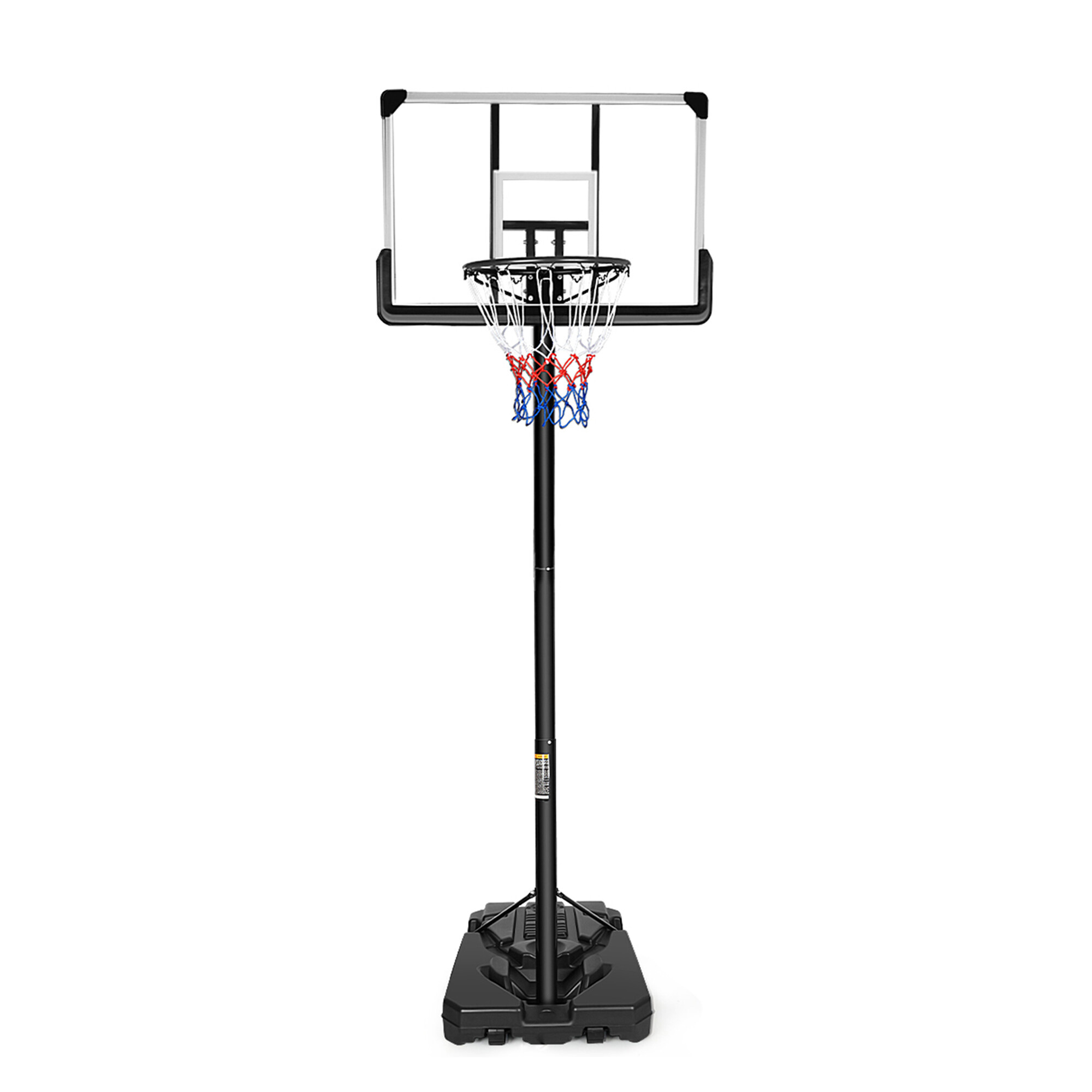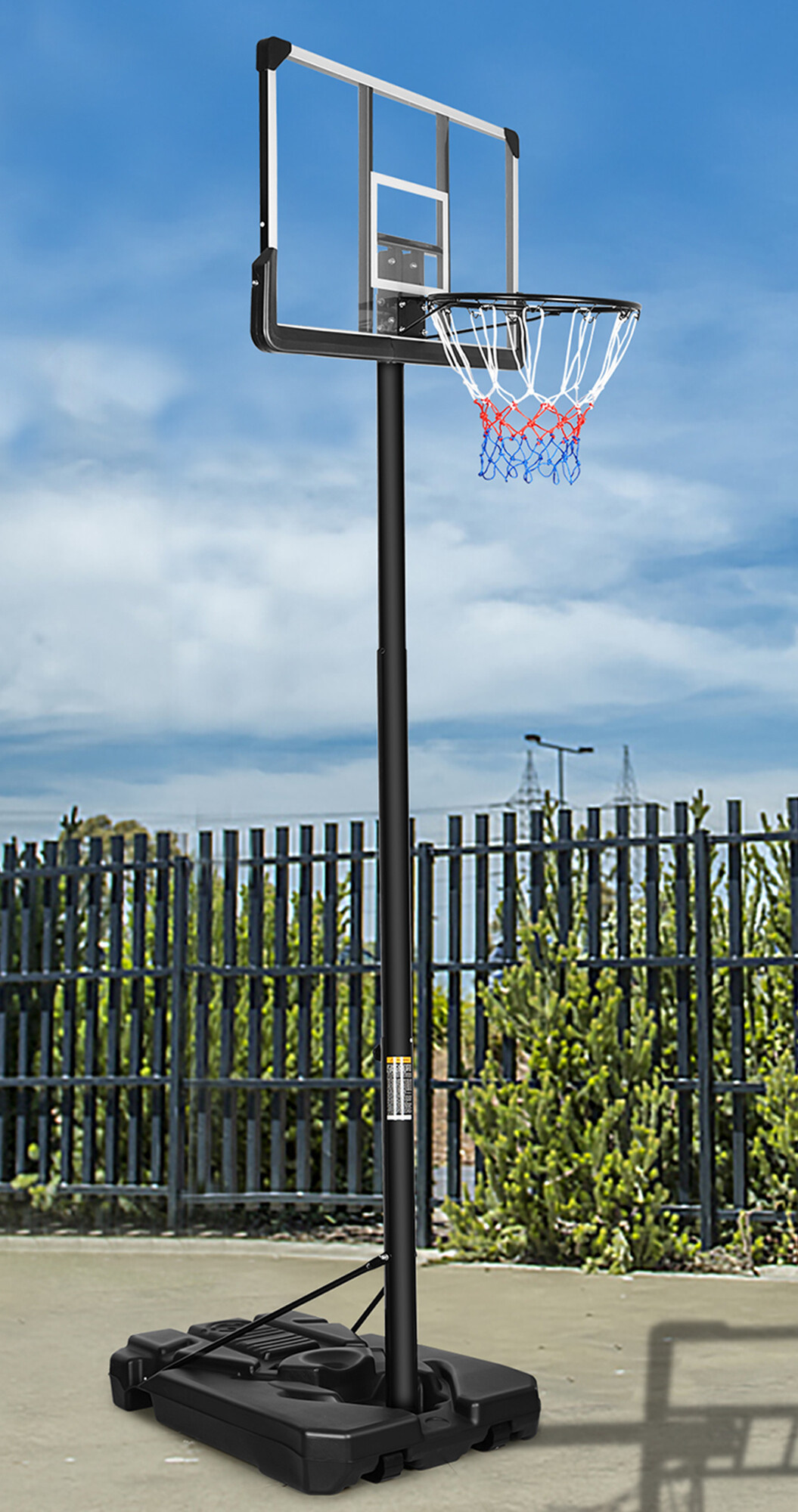 Mobilný basketbalový kôš s nastaviteľnou výškou, pevnou plastovou hornou časťou a sieťovým okrajom.Úplný popis