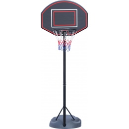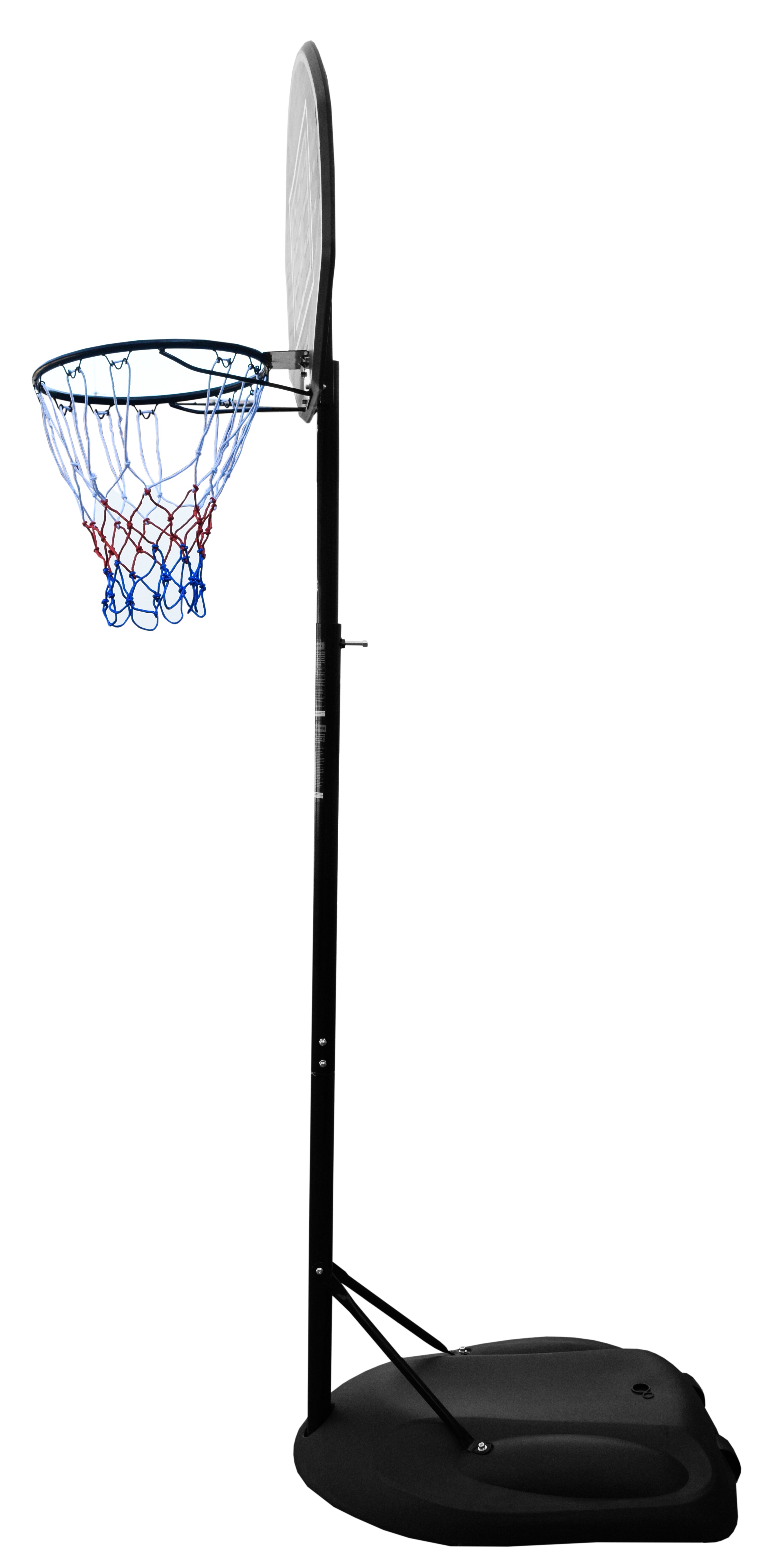 Mobilný basketbalový kôš s nastaviteľnou výškou, pevnou plastovou doskou a obručou so sieťou.