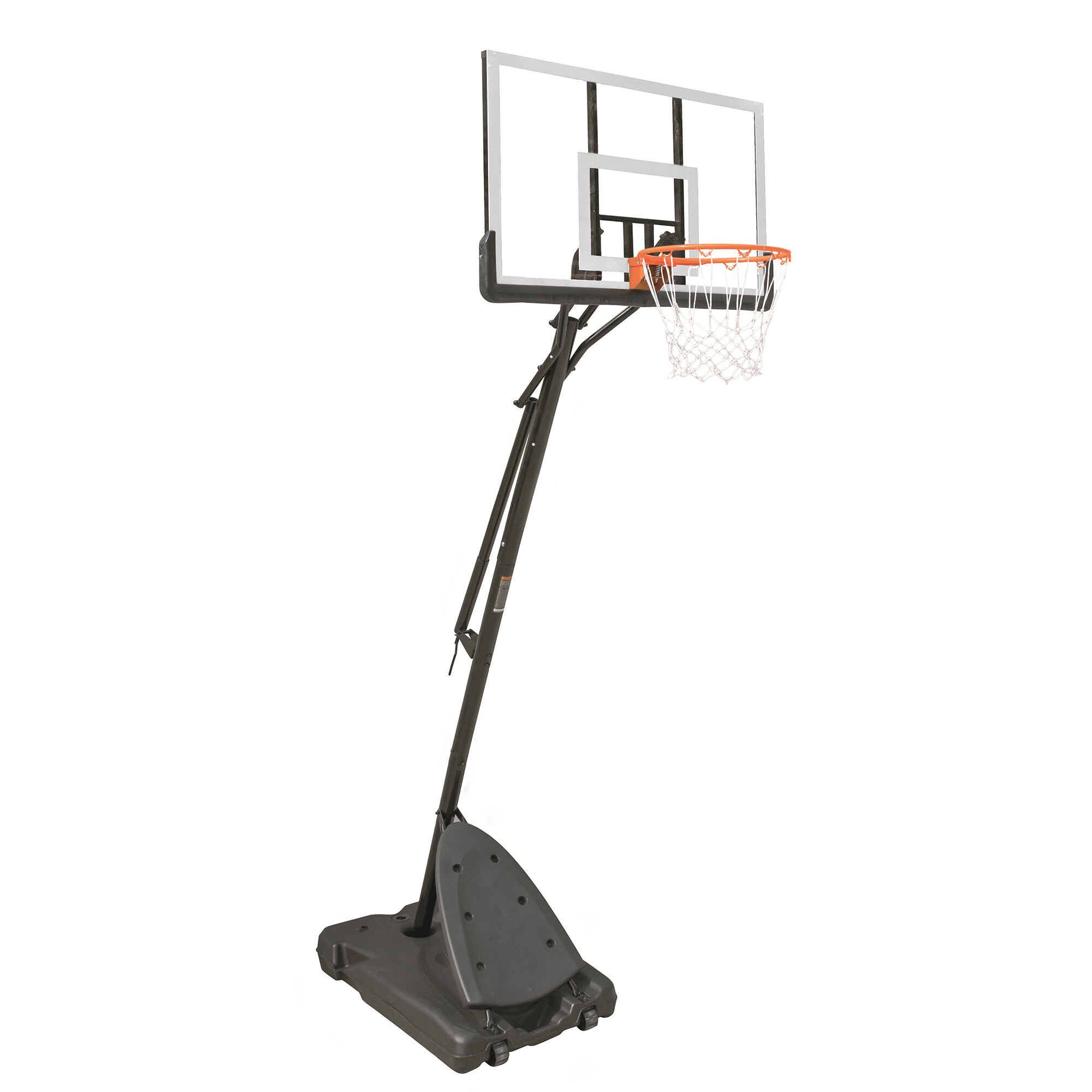 Mobilný basketbalový kôš s nastaviteľnou výškou, pevnou plastovou doskou a obručou so sieťou, ktorá má oficiálny rozmer.