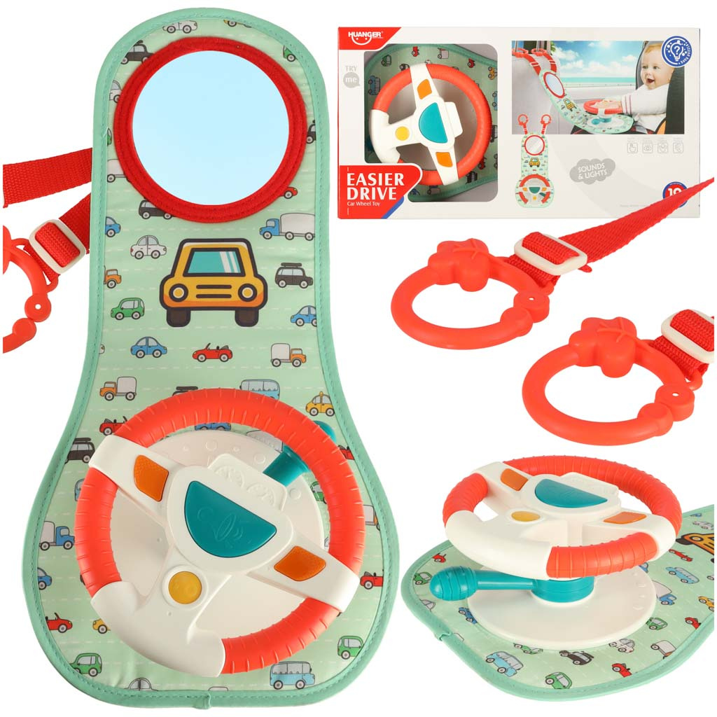 Rozjívené alebo plačúce dieťa na zadnom sedadle je pre vodiča vozidla veľkým stresom. Máme pre vás riešenie, ktoré vášmu batoľaťu spríjemní cestu a zabezpečí hladkú jazdu. Interaktívny volant je typ manipulačnej dosky, ktorá úspešne zamestná malé ruky po celý čas jazdy. Skladá sa z volantu so 4 tlačidlami, senzorickej rukoväti a plastového bezpečnostného zrkadielka. Kusy sú umiestnené na pevnej podložke potiahnutej príjemnou látkou s motívom autíčok.