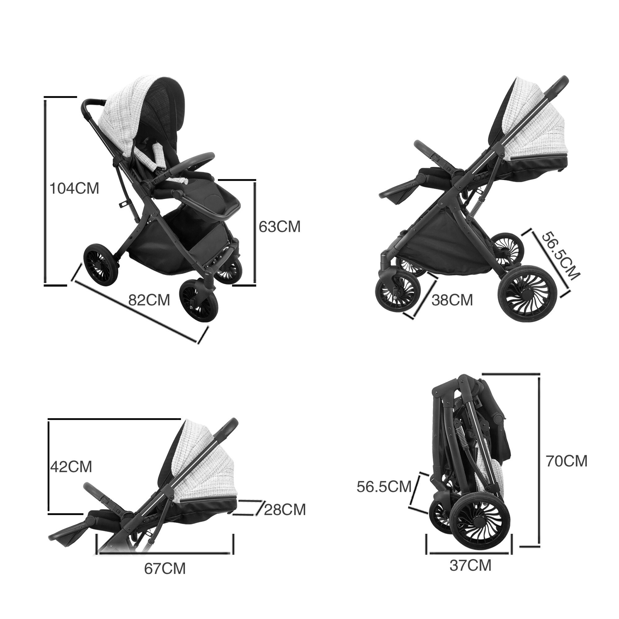 • Rozmery rozloženého kočíka: 104 x 56,5 x 82 cm