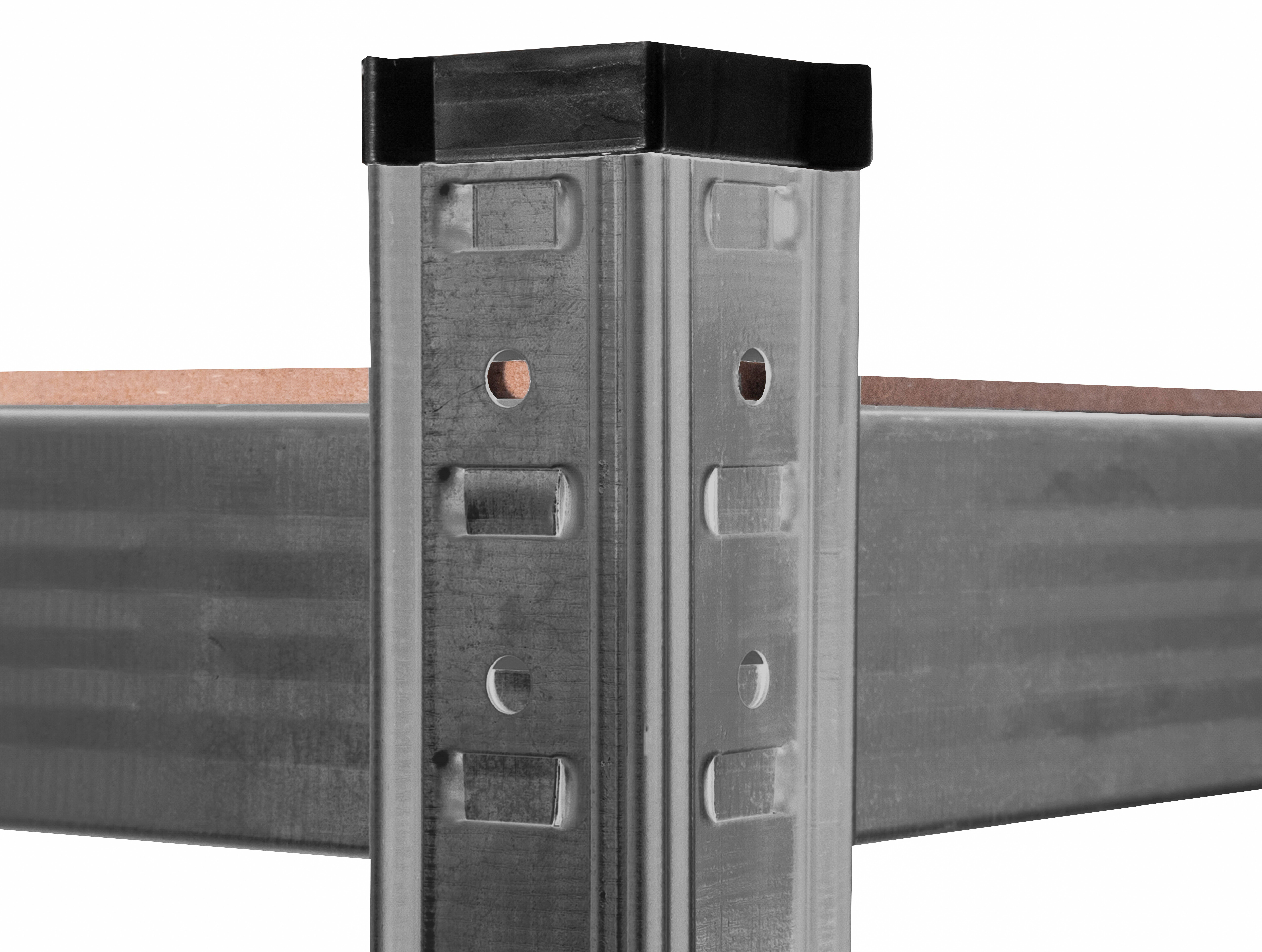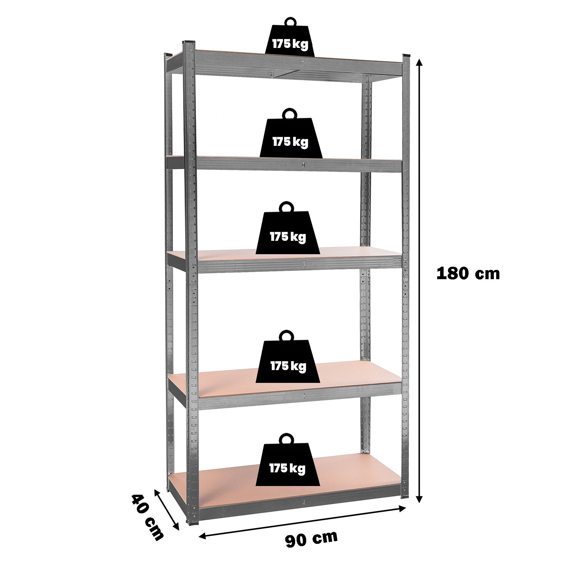 Vo výške cca 180 cm máte k dispozícii 5 políc z mdf, ktoré je možné výškovo vložiť podľa potreby. Rám z galvanizovanej ocele v čiernej farbe zaručuje stabilitu a veľkú nosnosť cca 875 kg (na každú policu pripadá cca 175 kg).