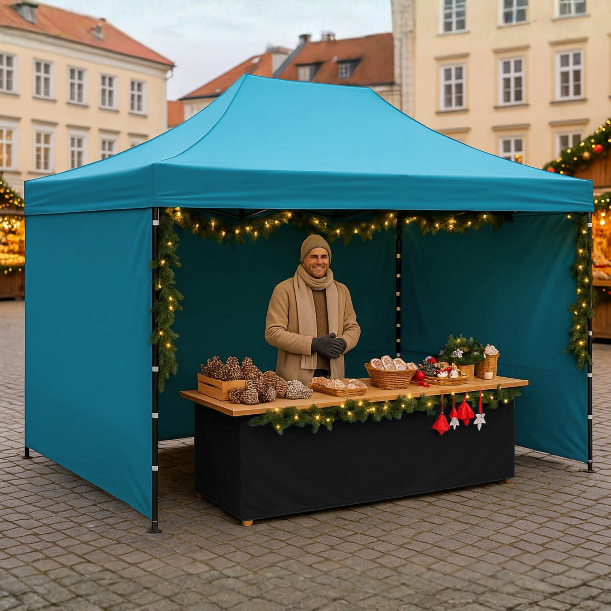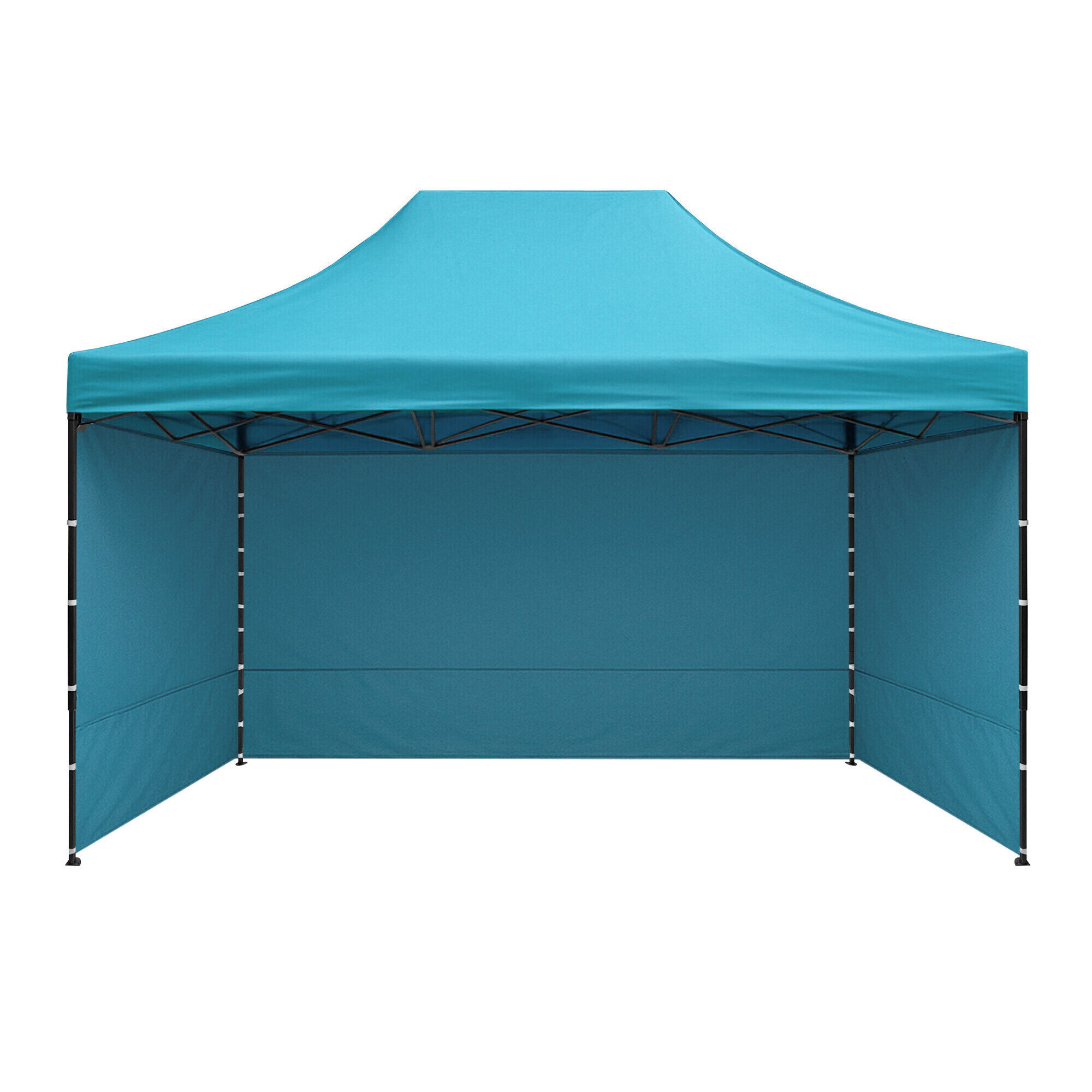Strecha z odolného 420D PU Oxfordu a bočnice z PVC Oxford 210D poskytujú ochranu proti vetru aj slnku a vytvárajú pohodlné zázemie pre obchodníkov aj návštevníkov. Bočnice je možné kedykoľvek rýchlo zložiť alebo pripevniť vďaka suchým zipsom, takže stánok ľahko prispôsobíte situácii.