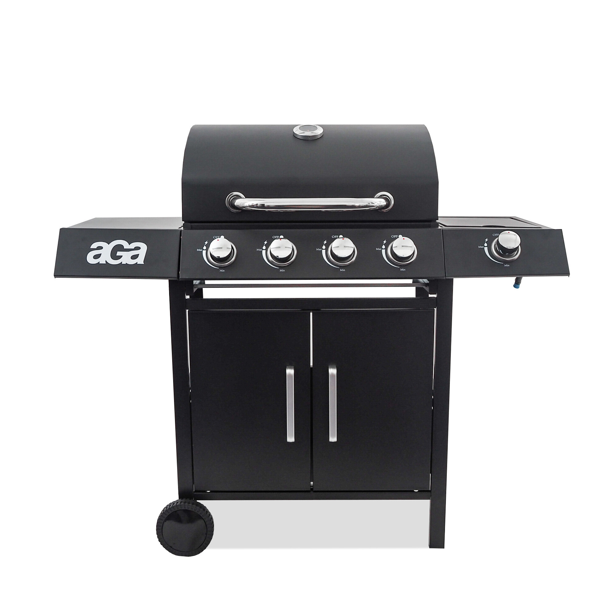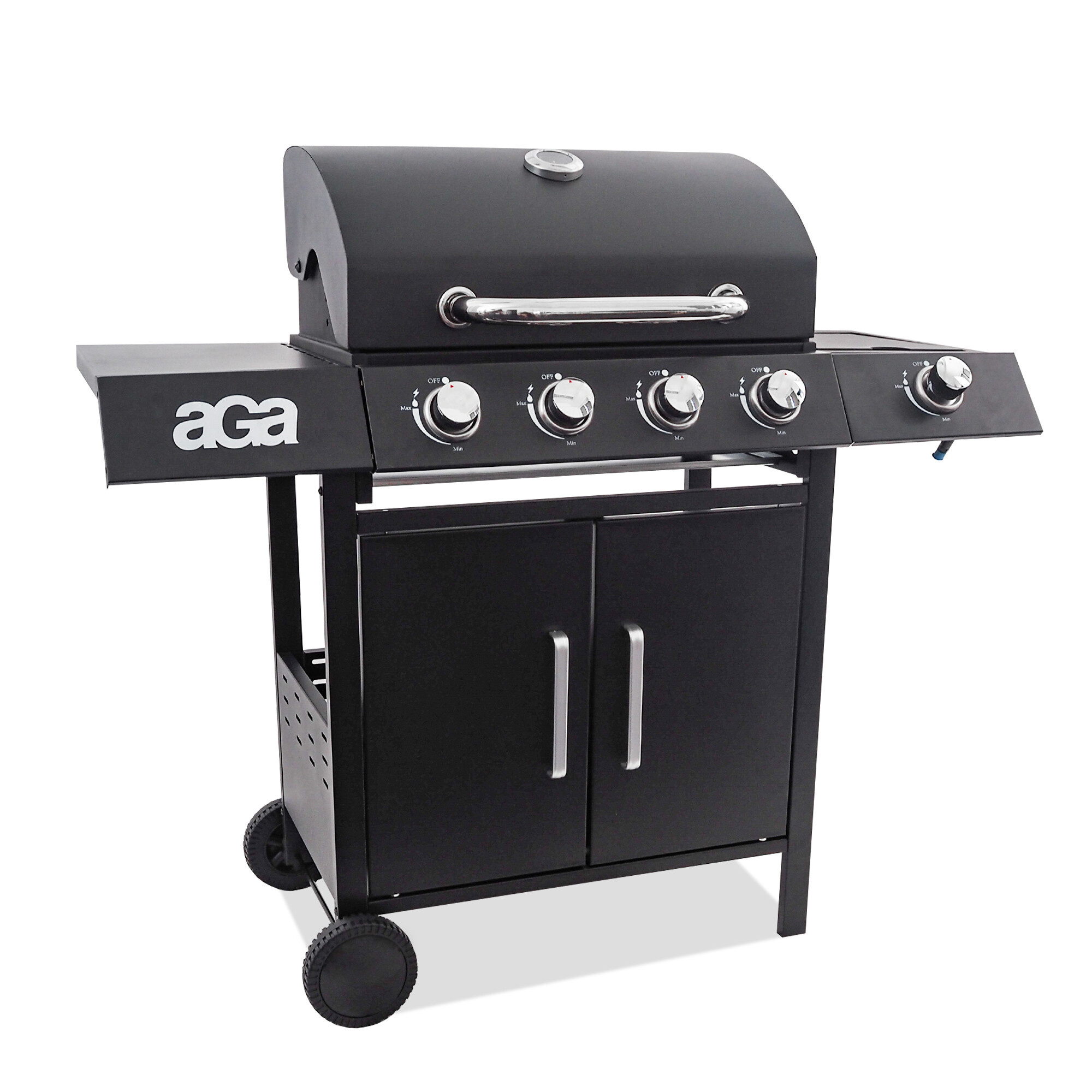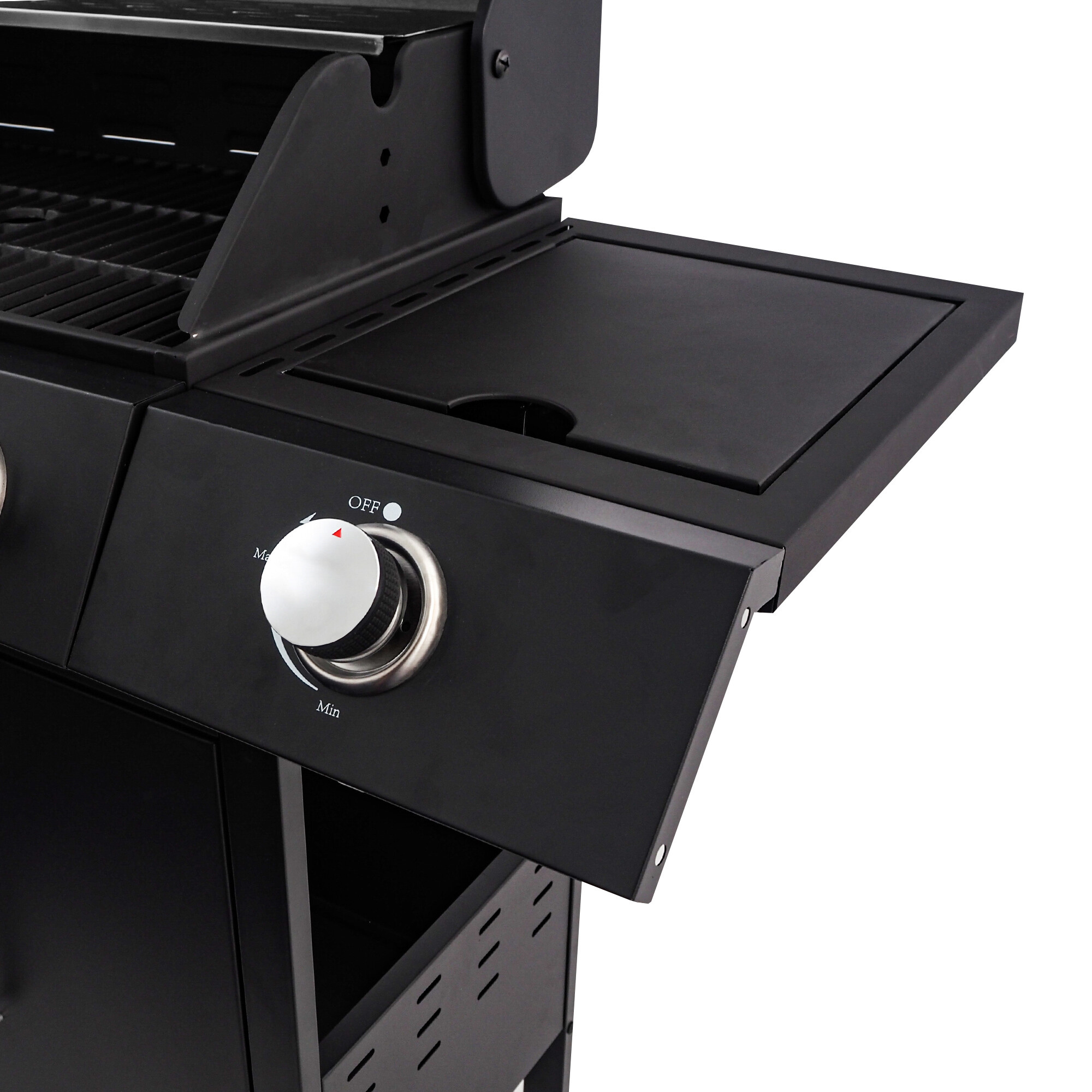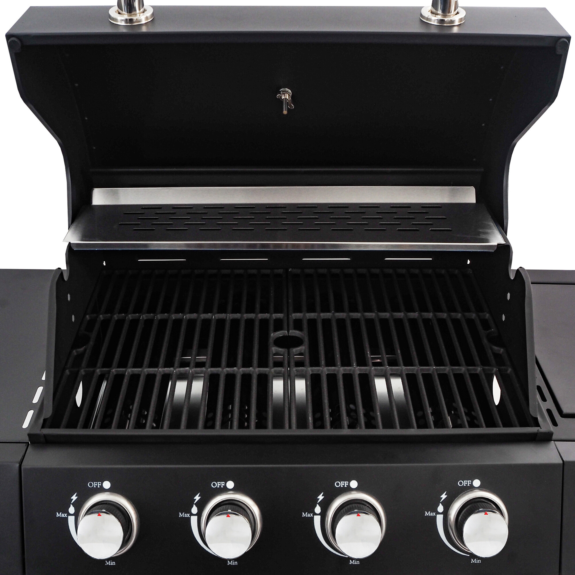 Praktické uzatvárateľné veko bočného horáka umožňuje v prípade uzavretia použitie ako pracovná alebo odkladacia plocha.Veľmi praktický je odkladací rošt, kde môžete udržiavať už hotové pokrmy stále teplé a pripravené na konzumáciu.Gril je osadený praktickým sklopným vekom so zabudovaným teplomerom