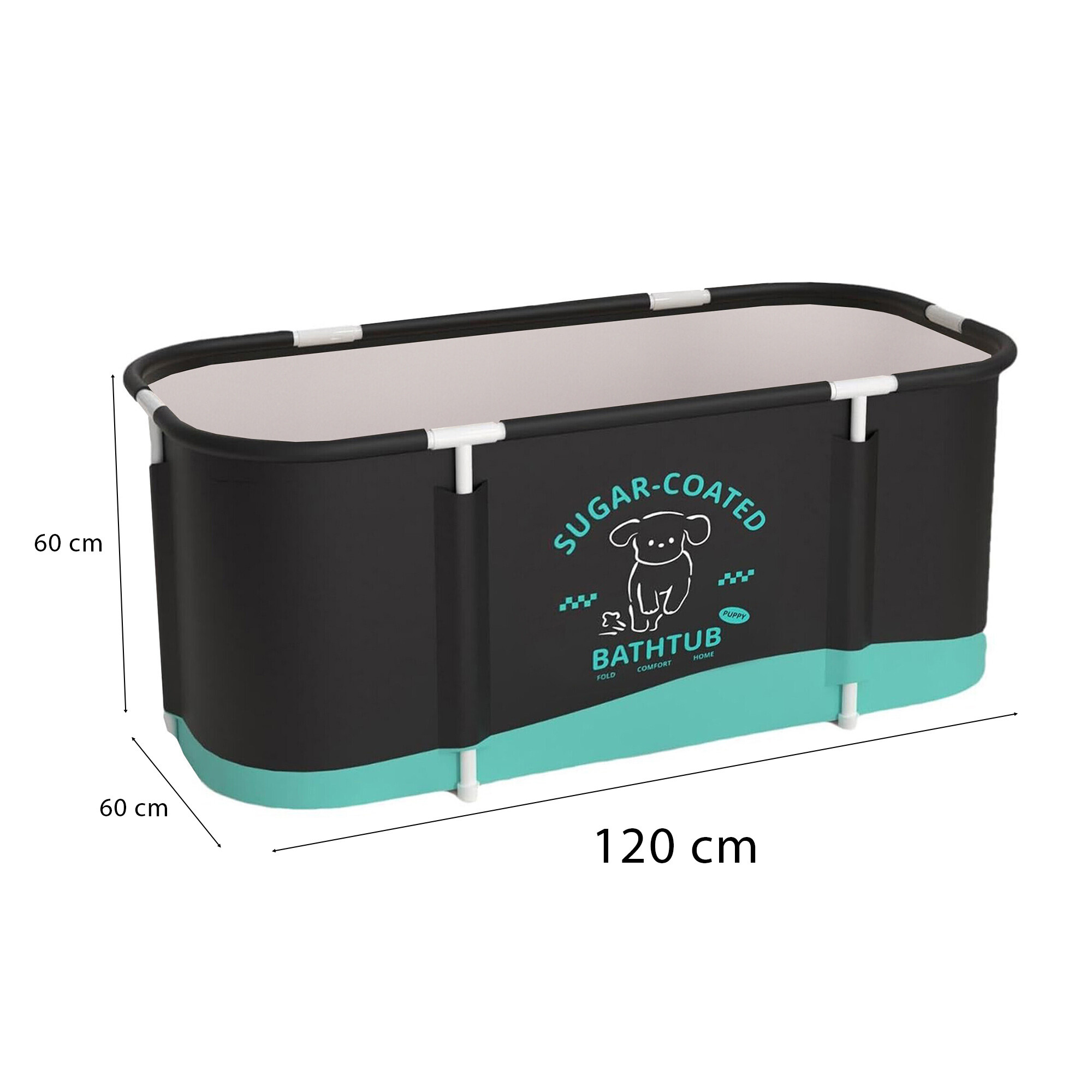 Skladacia prenosná vaňa má rozmery 120 × 60 × 60 cm, takže ponúka dostatok priestoru pre pohodlný kúpeľ aj v menších domácnostiach.