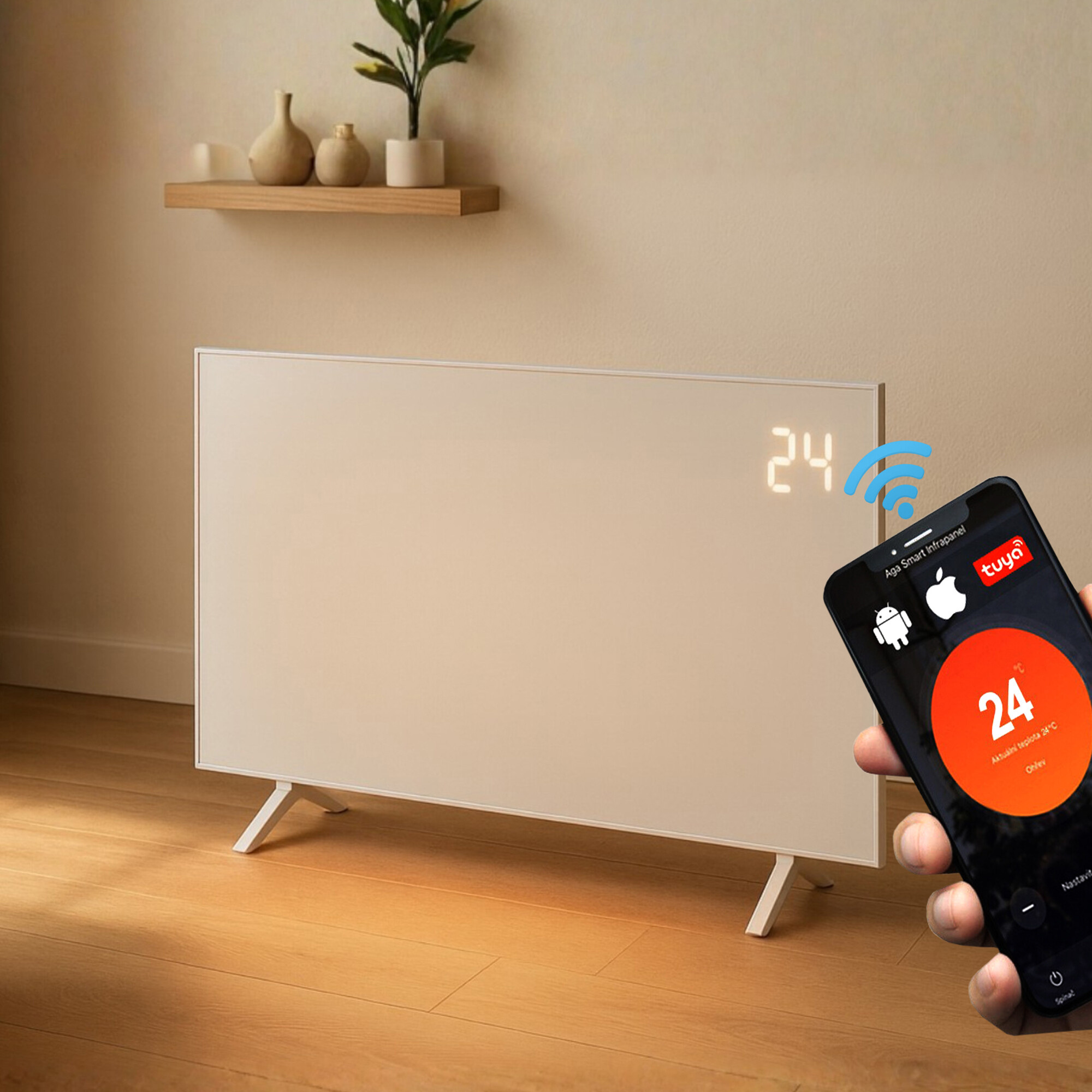 Panel zle aj ovládať pomocou diaľkového ovládania alebo vďaka integrovanej Wi-Fi sa môže vykurovací panel pripojiť k internetu a potom ho ovládať odkiaľkoľvek prostredníctvom aplikácie Tuya.