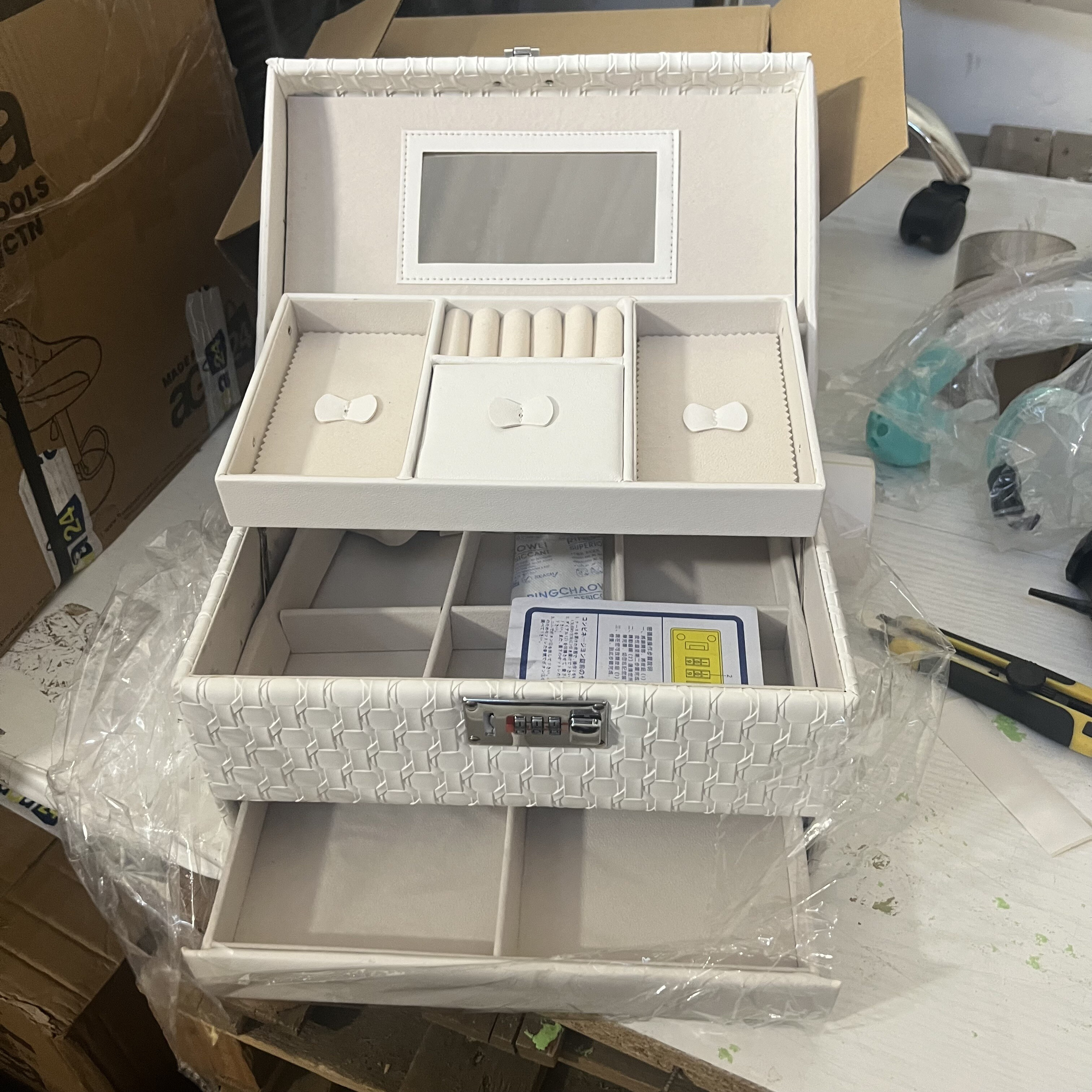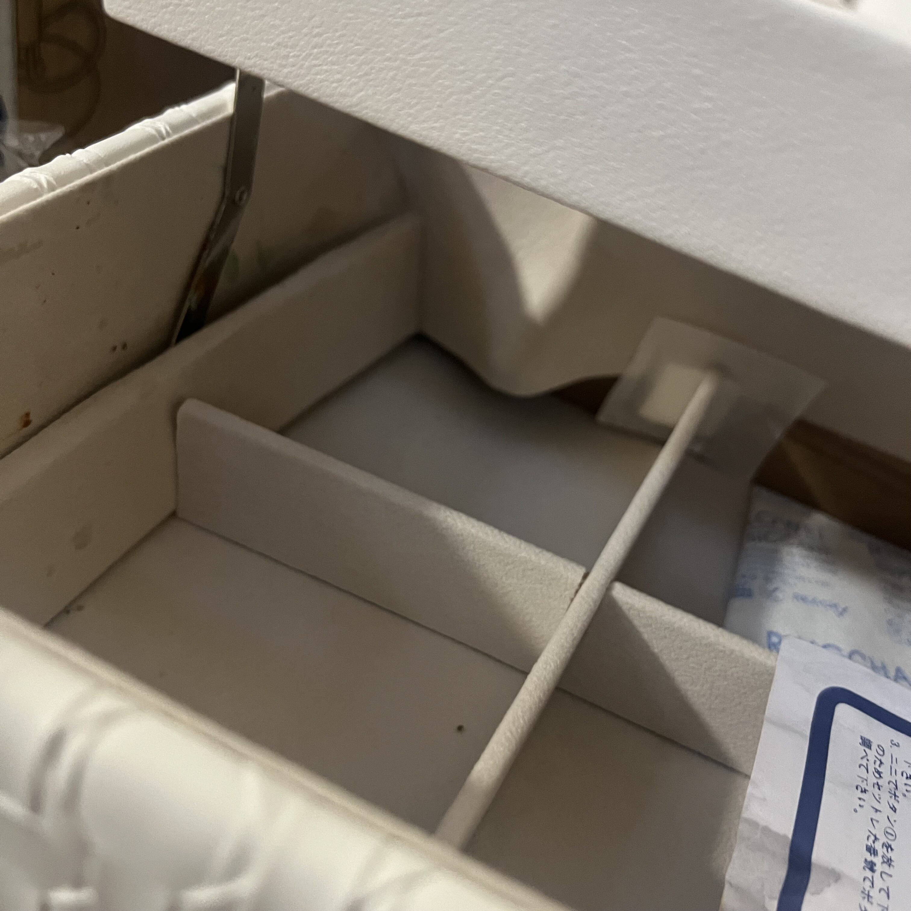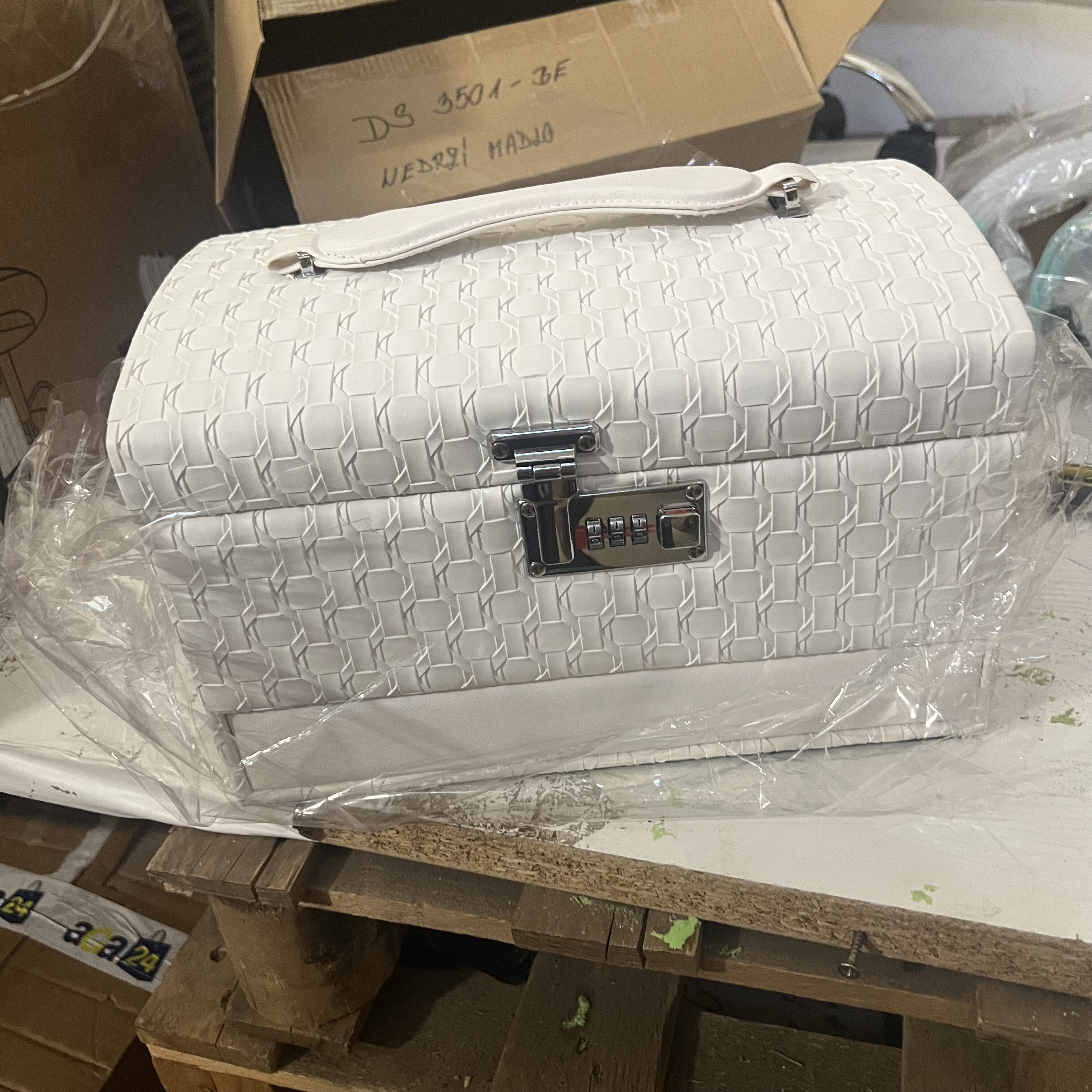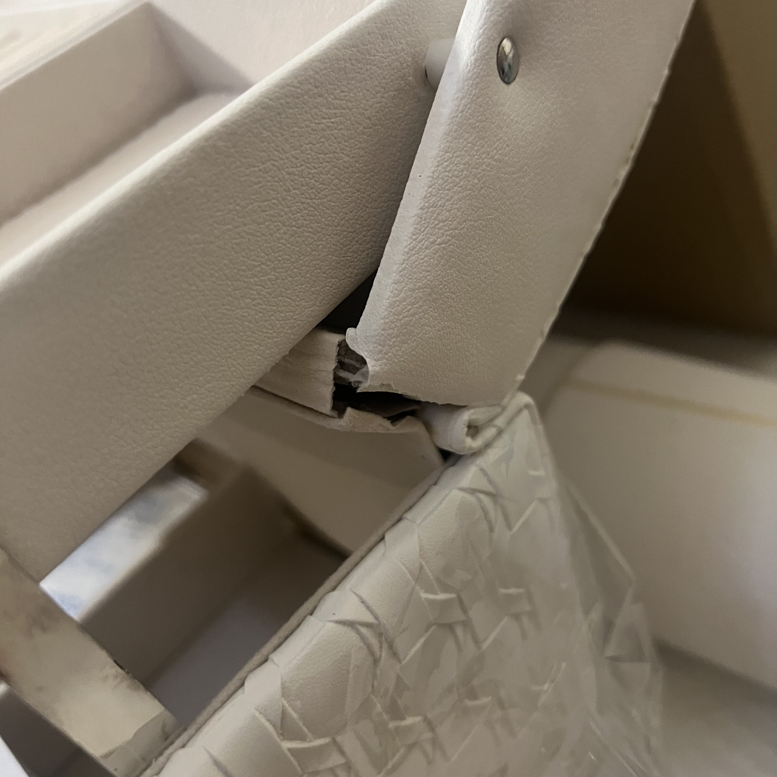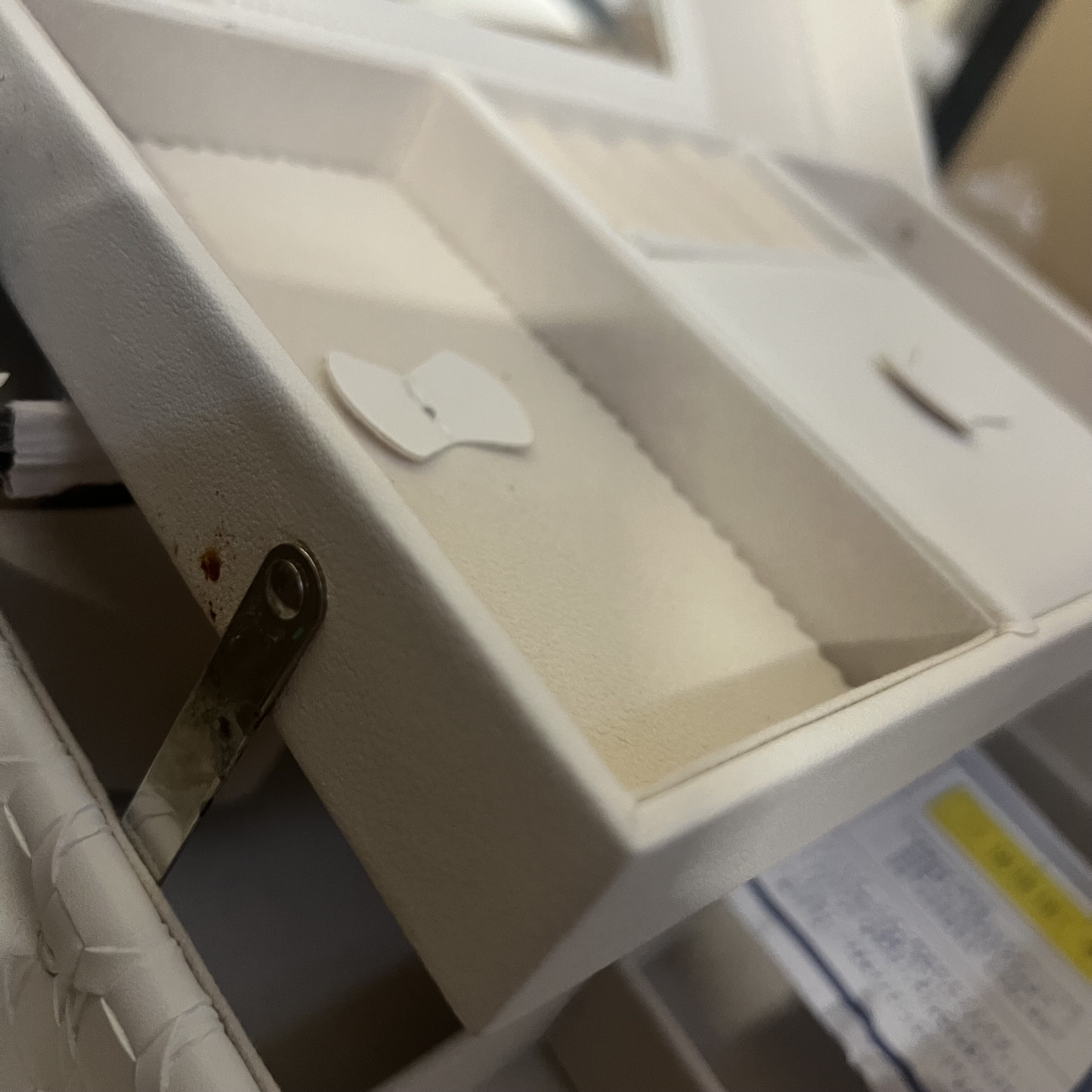 Šperkovnica má ulomený úchyt (možná oprava) a odpadá vnútorná časť materiálu.