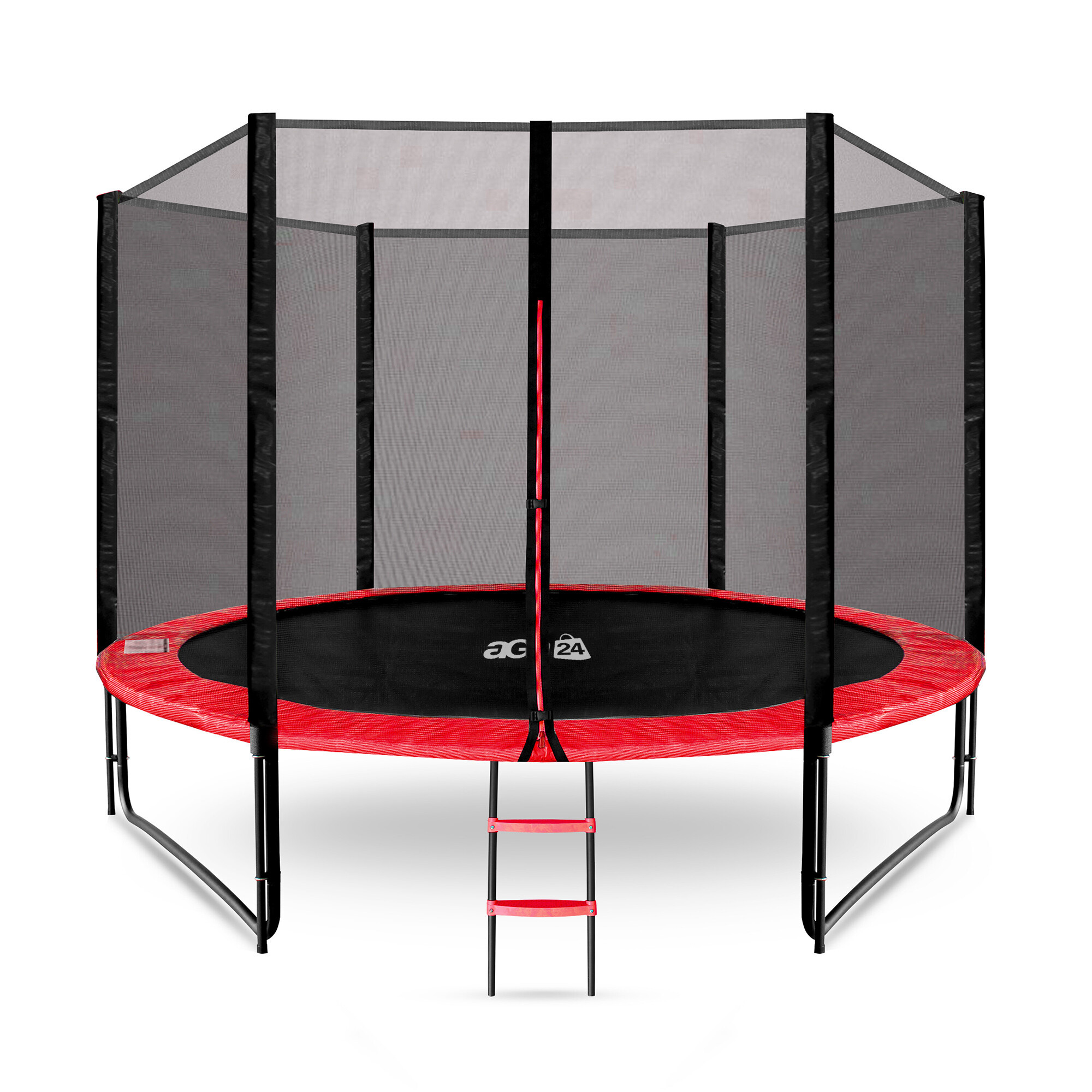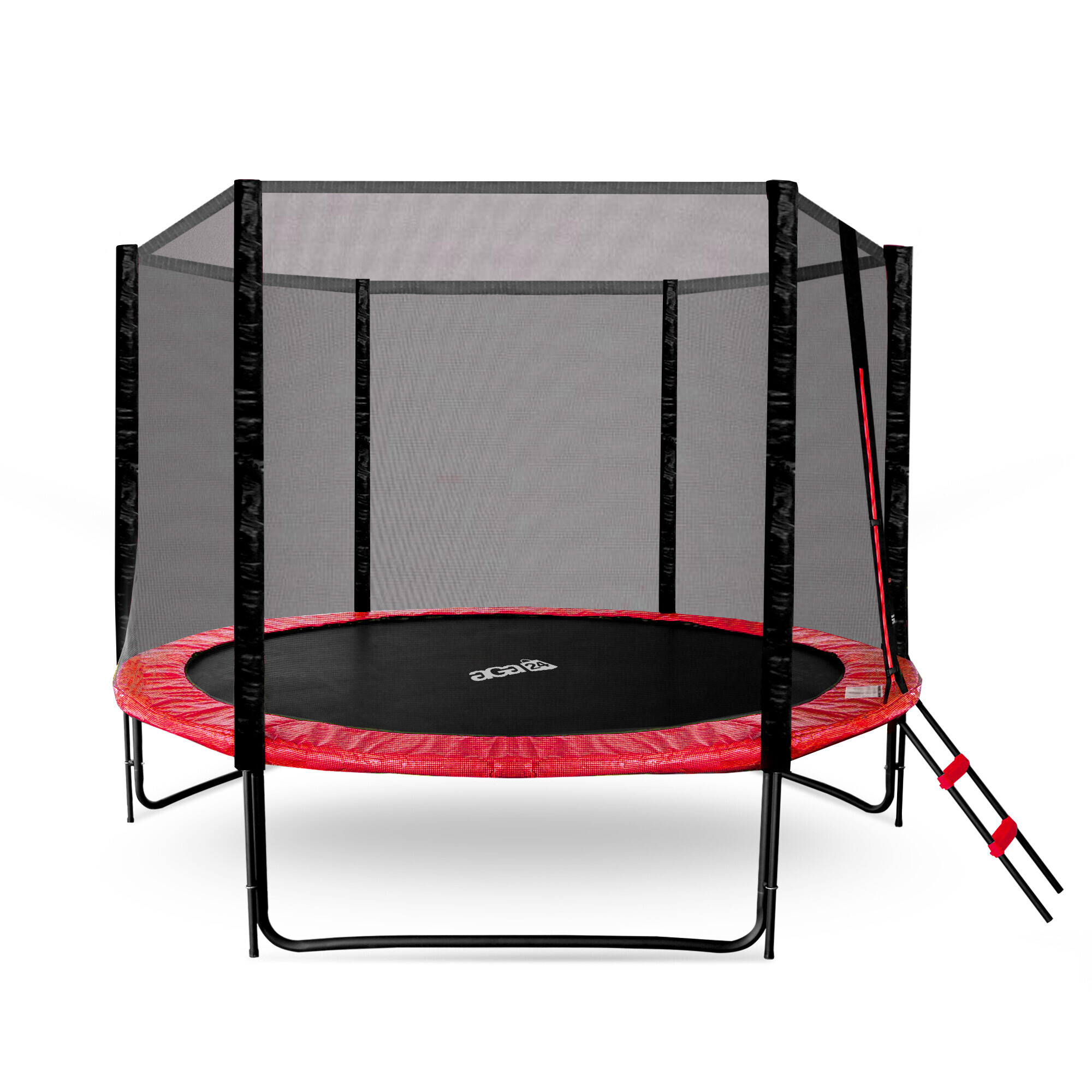 Špecifikácia trampolíny Aga SPORT PRO 305 cm Červená s ochrannou sieťou a rebríkom.