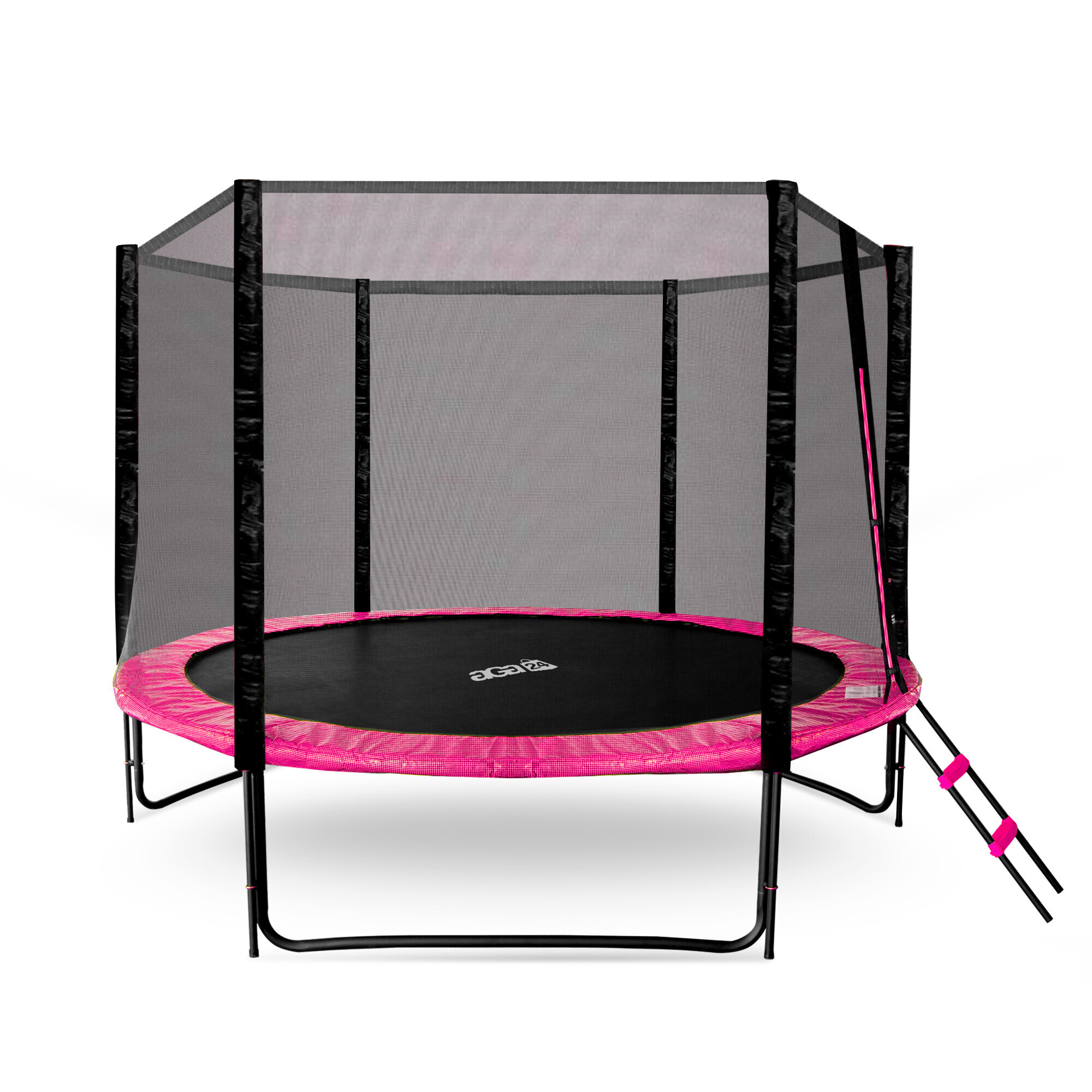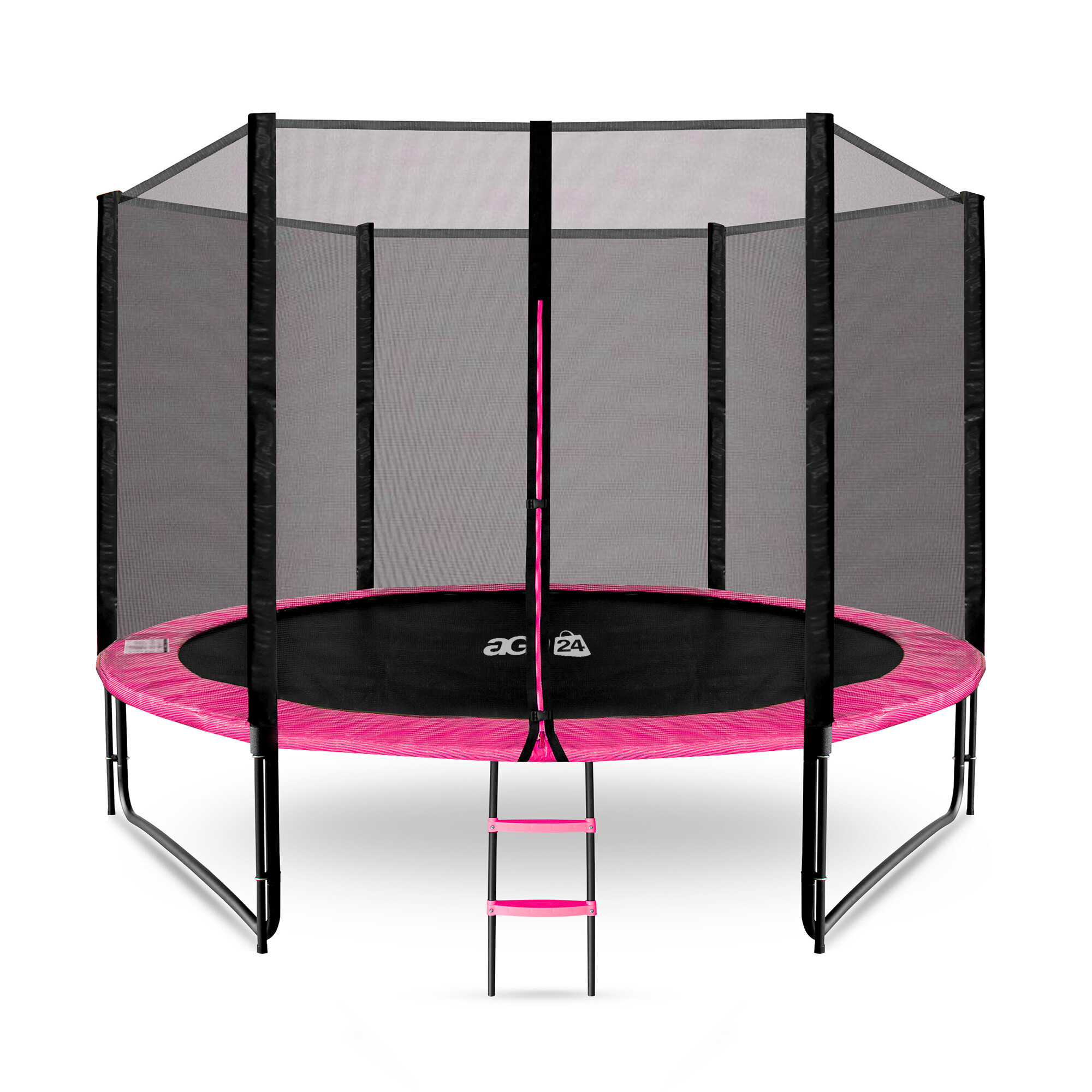 Špecifikácia trampolíny Aga SPORT PRO 305 cm Ružová s ochrannou sieťou a rebríkom.