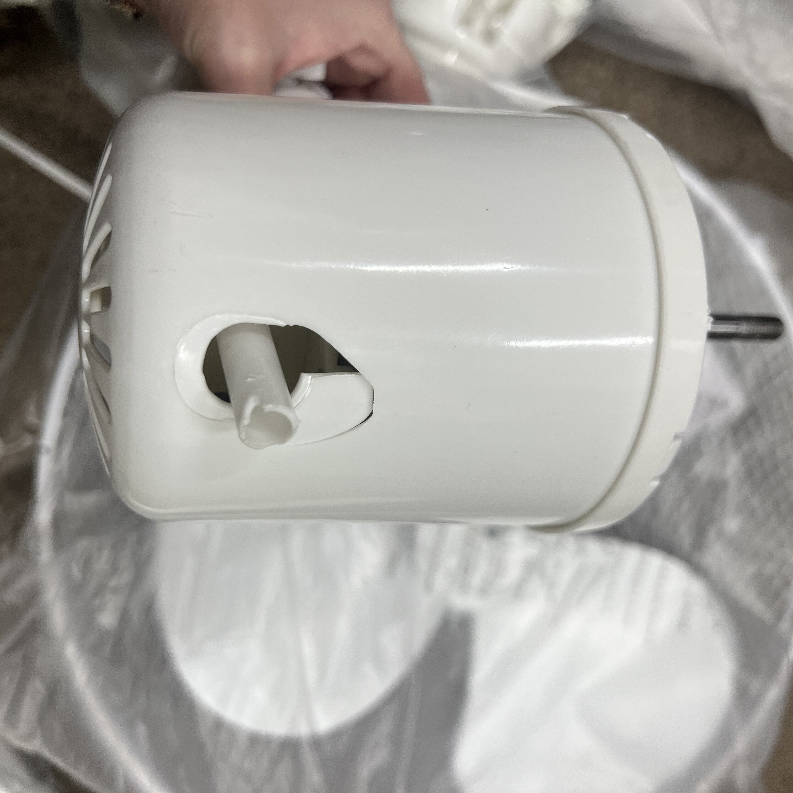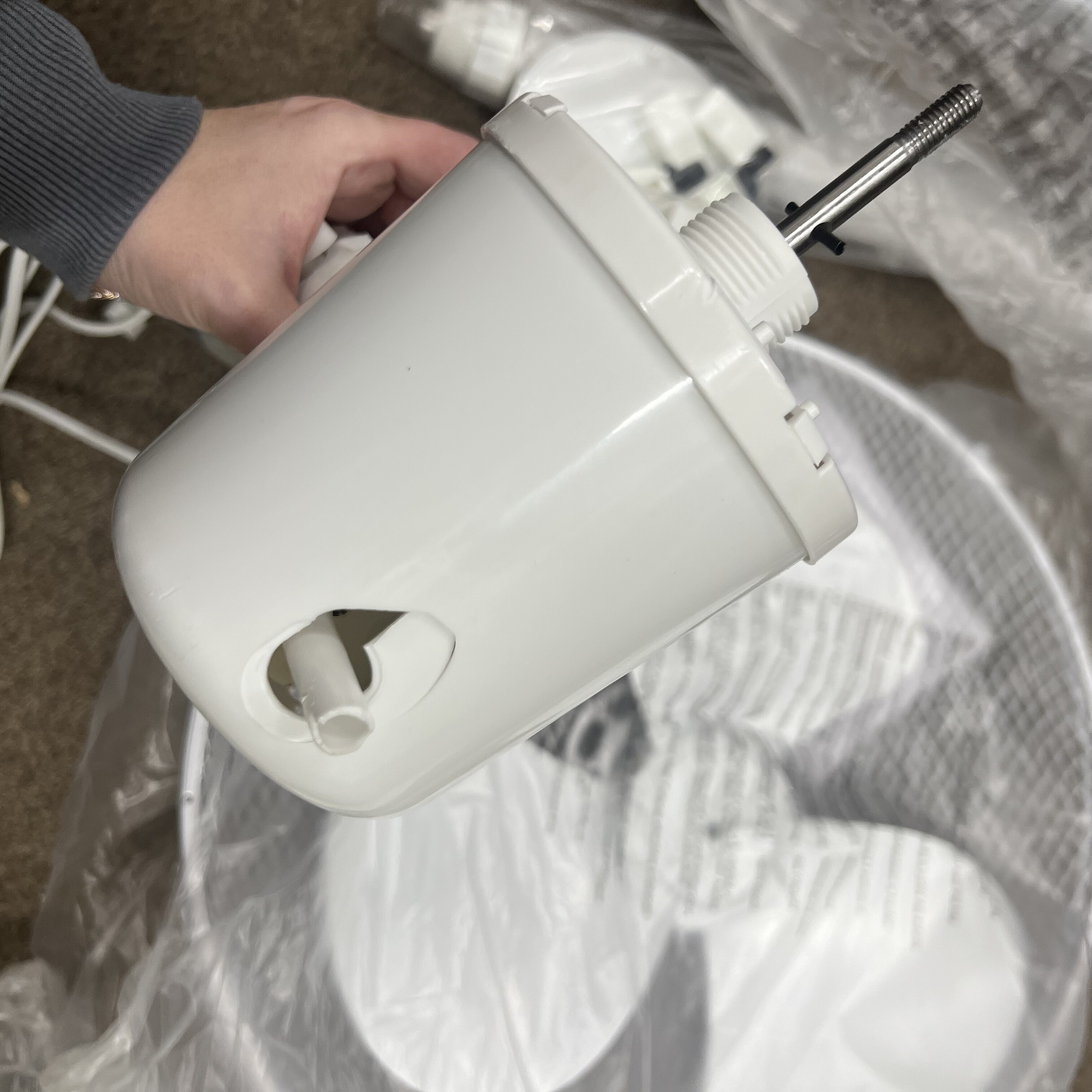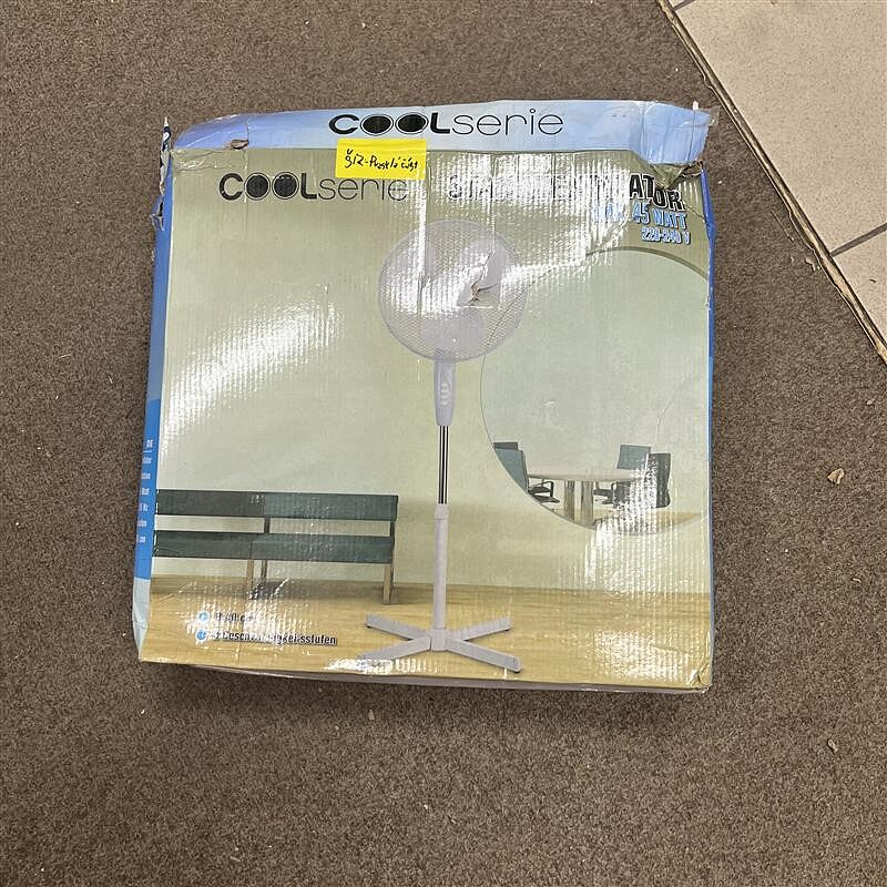 Ventilátor vykazuje poškodenie, ale je funkčný. V blízkosti prepínača otáčok sa nachádza prasklina.