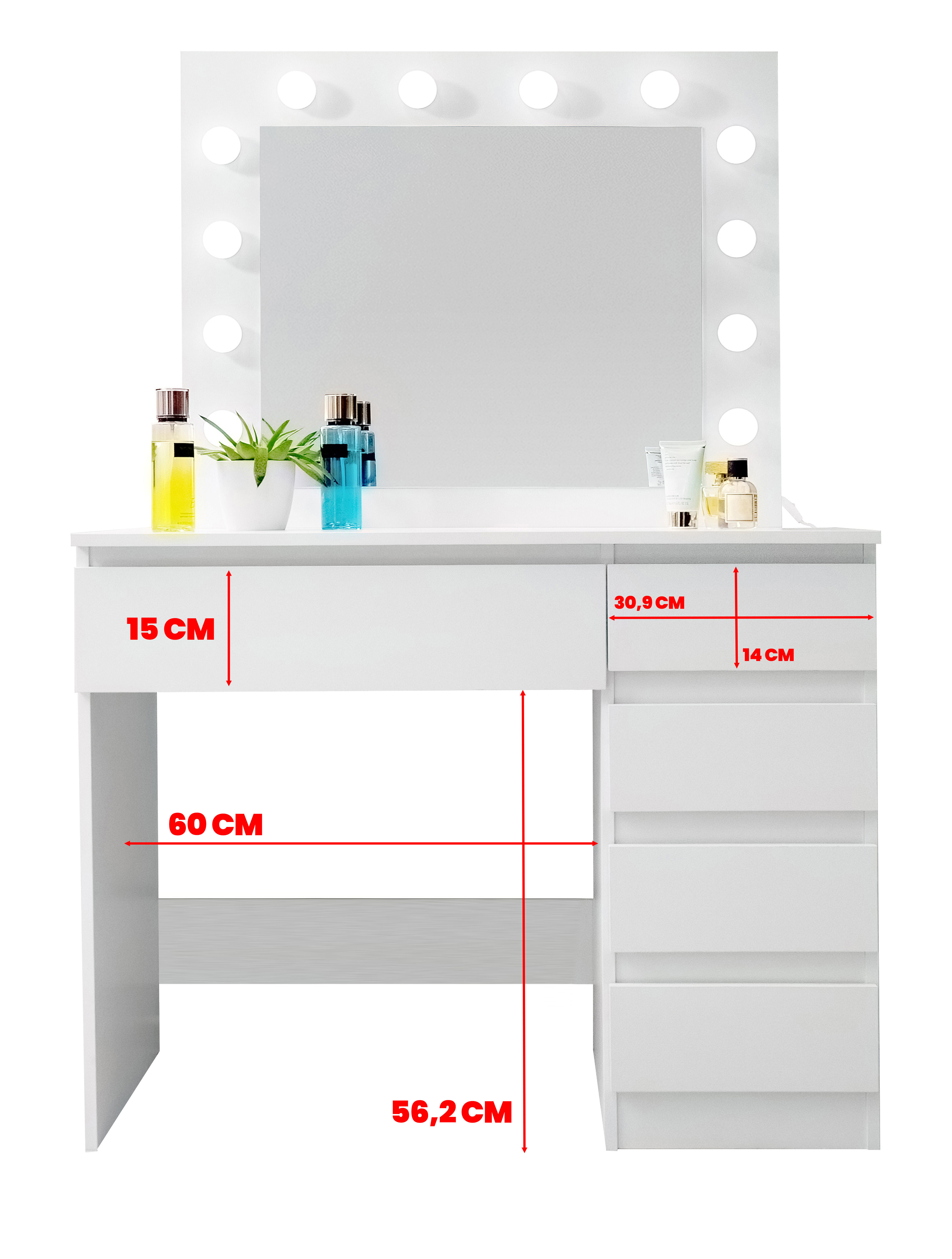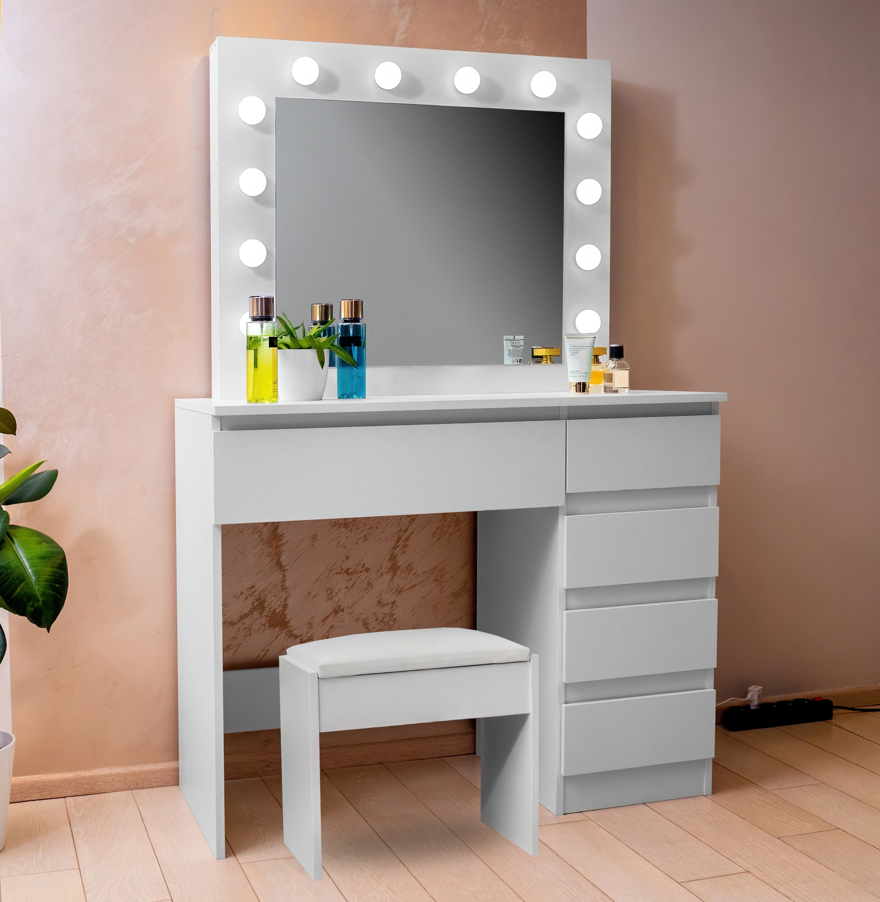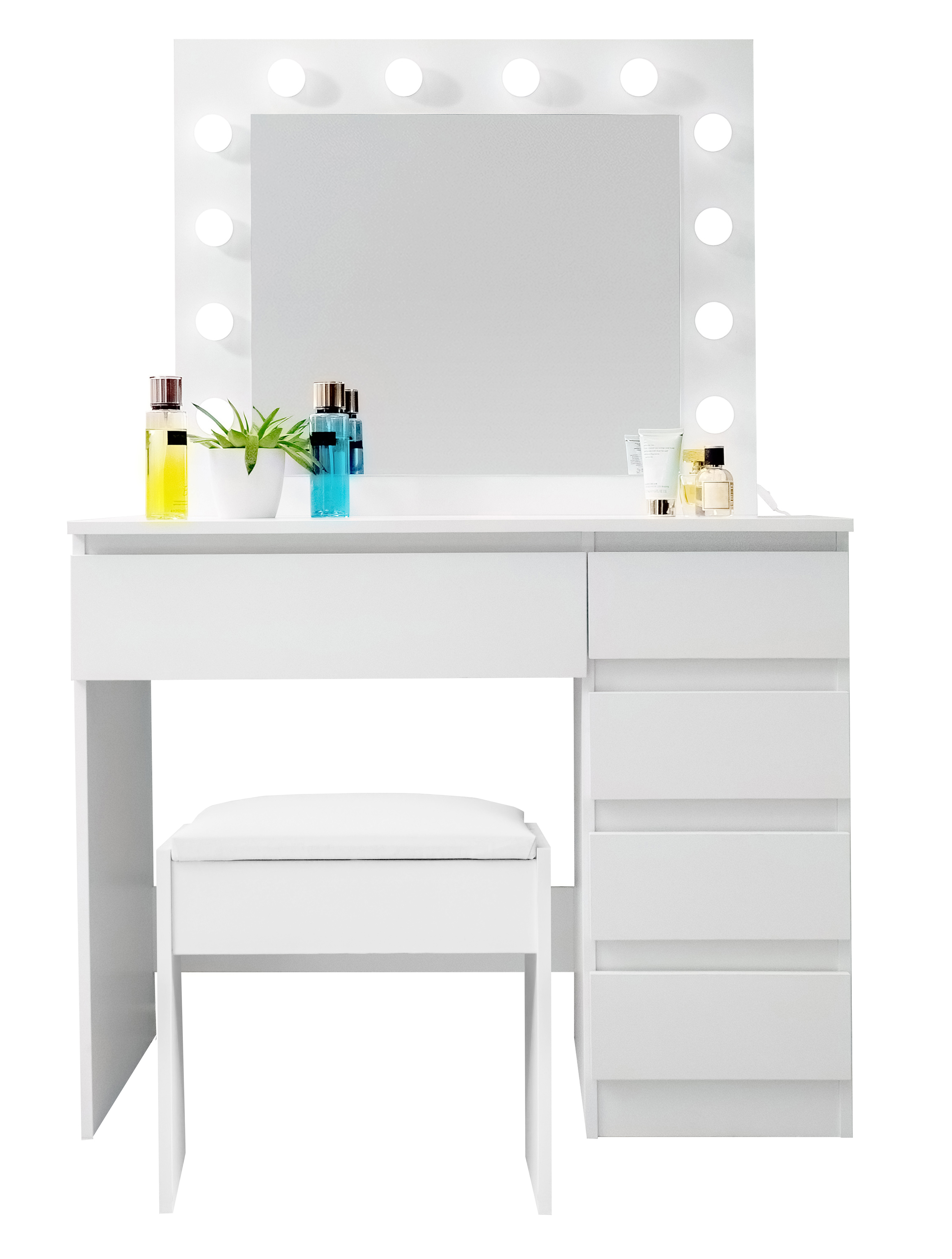 V zrkadle je 12 žiaroviek LED, takže sa môžete pohodlne líčiť aj pri slabom prirodzenom svetle.Stolička je vyrobená z kvalitnej mäkkej peny, na ktorej môžete sedieť celé hodiny.