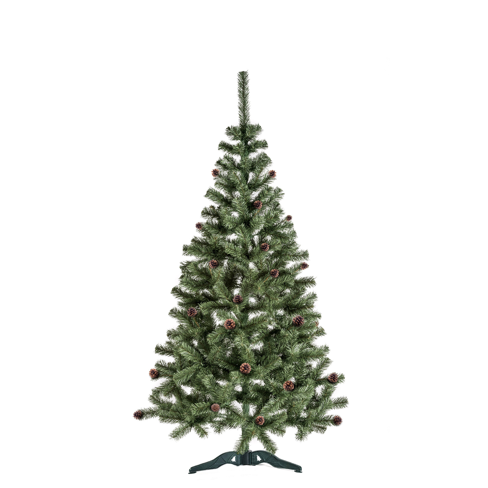 Súčasťou balenia vianočného stromčeka sú šišky aj štvorramenný plastový stojan.