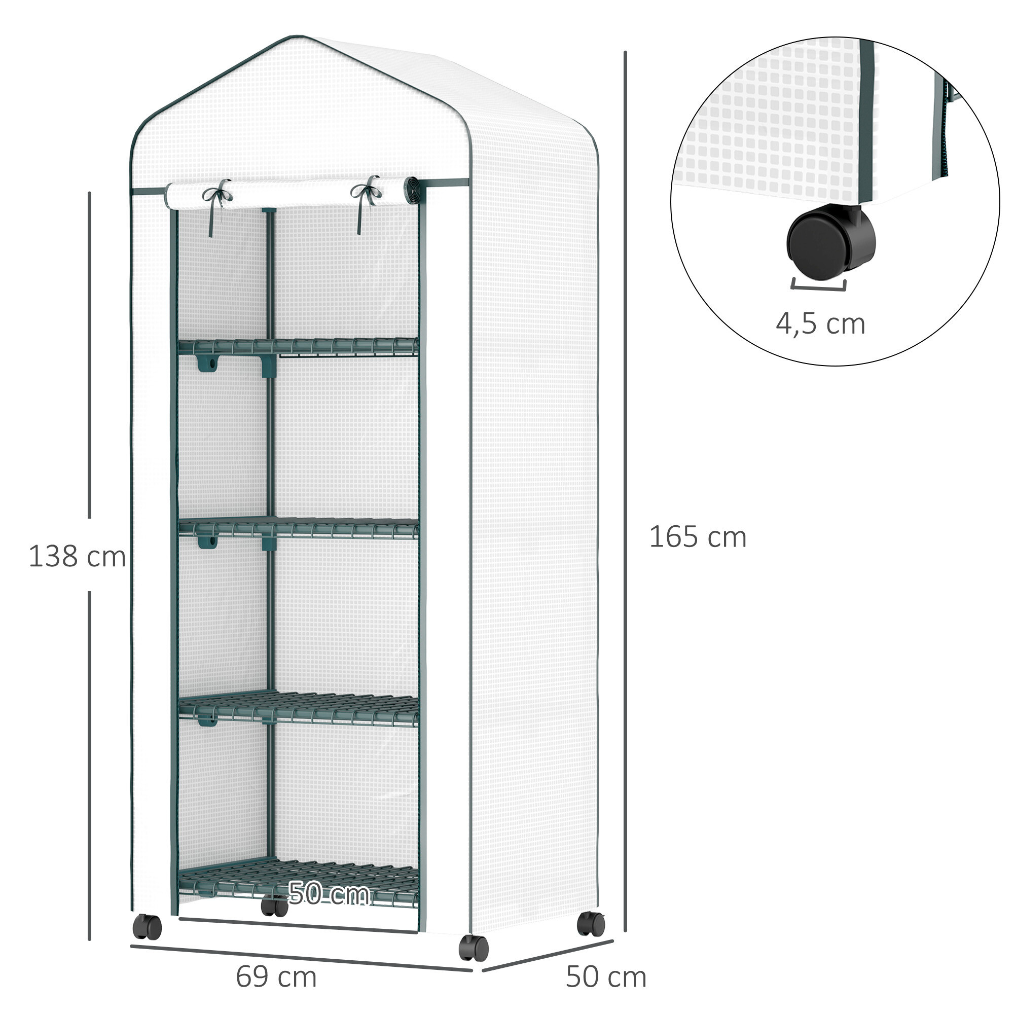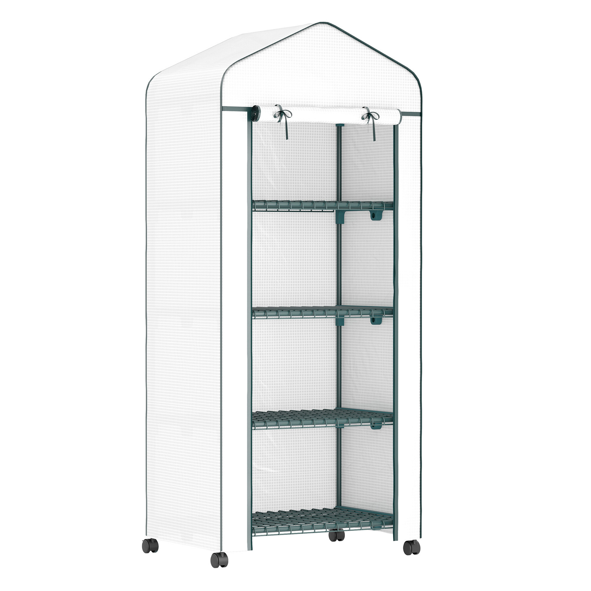 Fóliovník je vybavený štyrmi policami, má rolovacie dvere a posuvné kolieska, takže ho môžete ľahko premiestniť podľa potrieb.