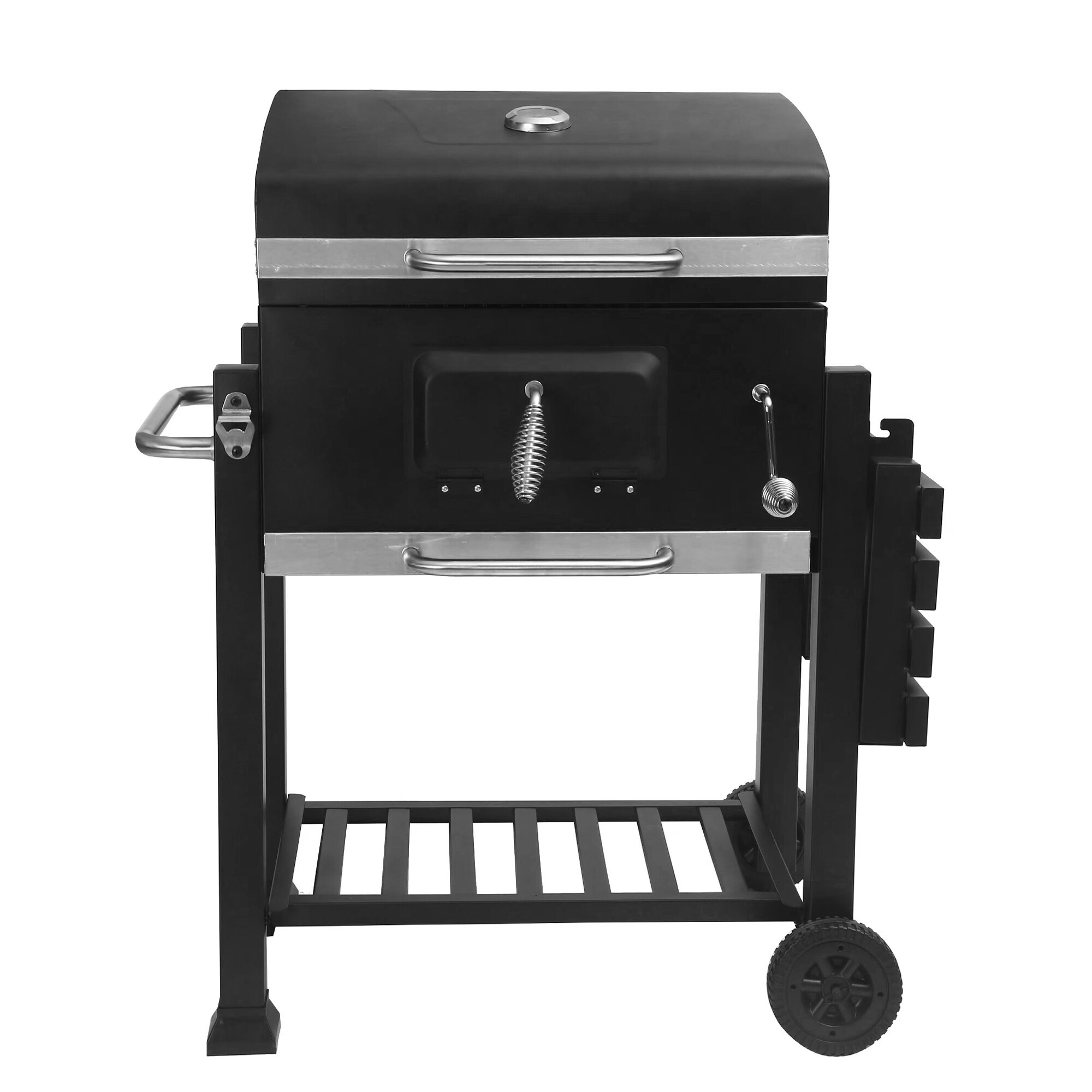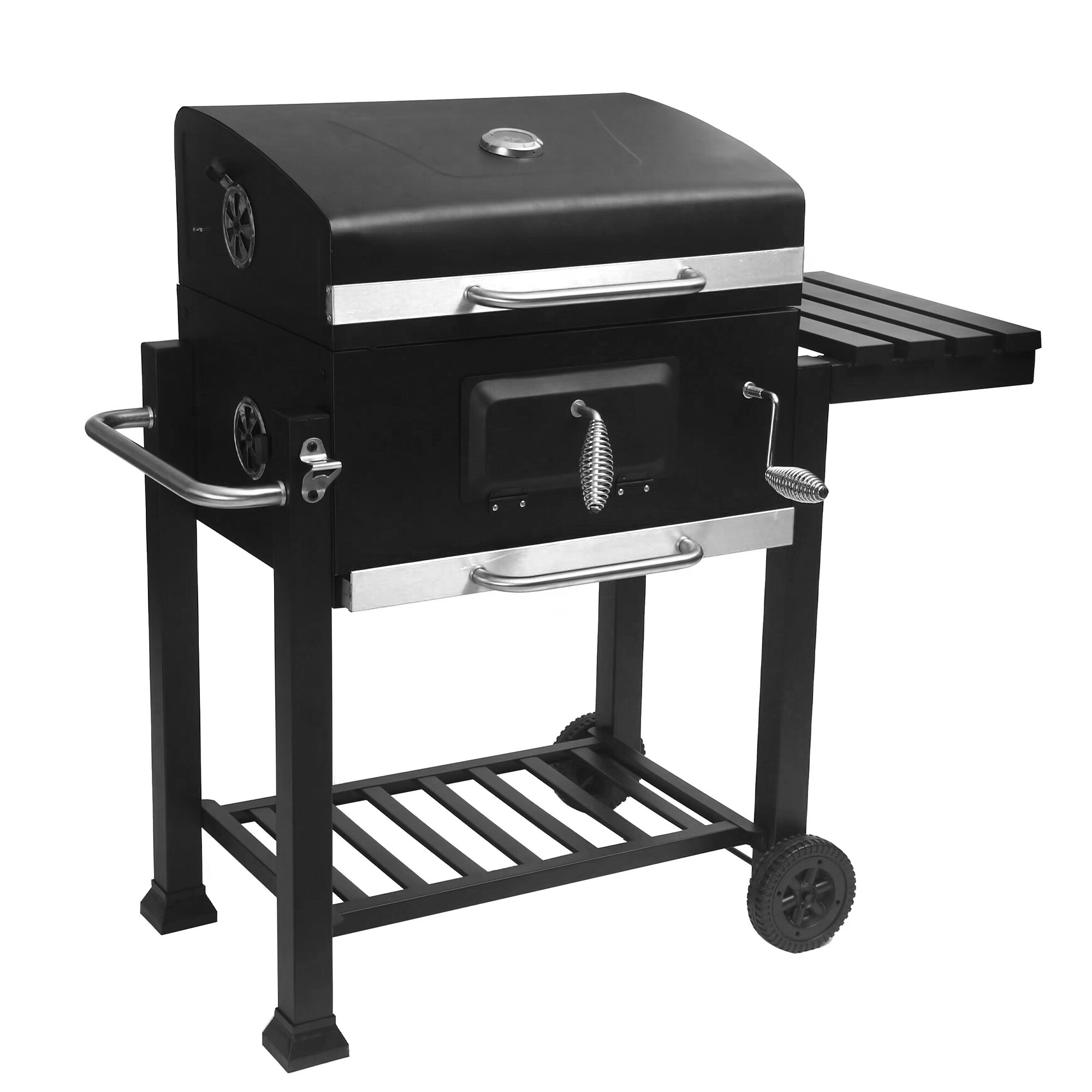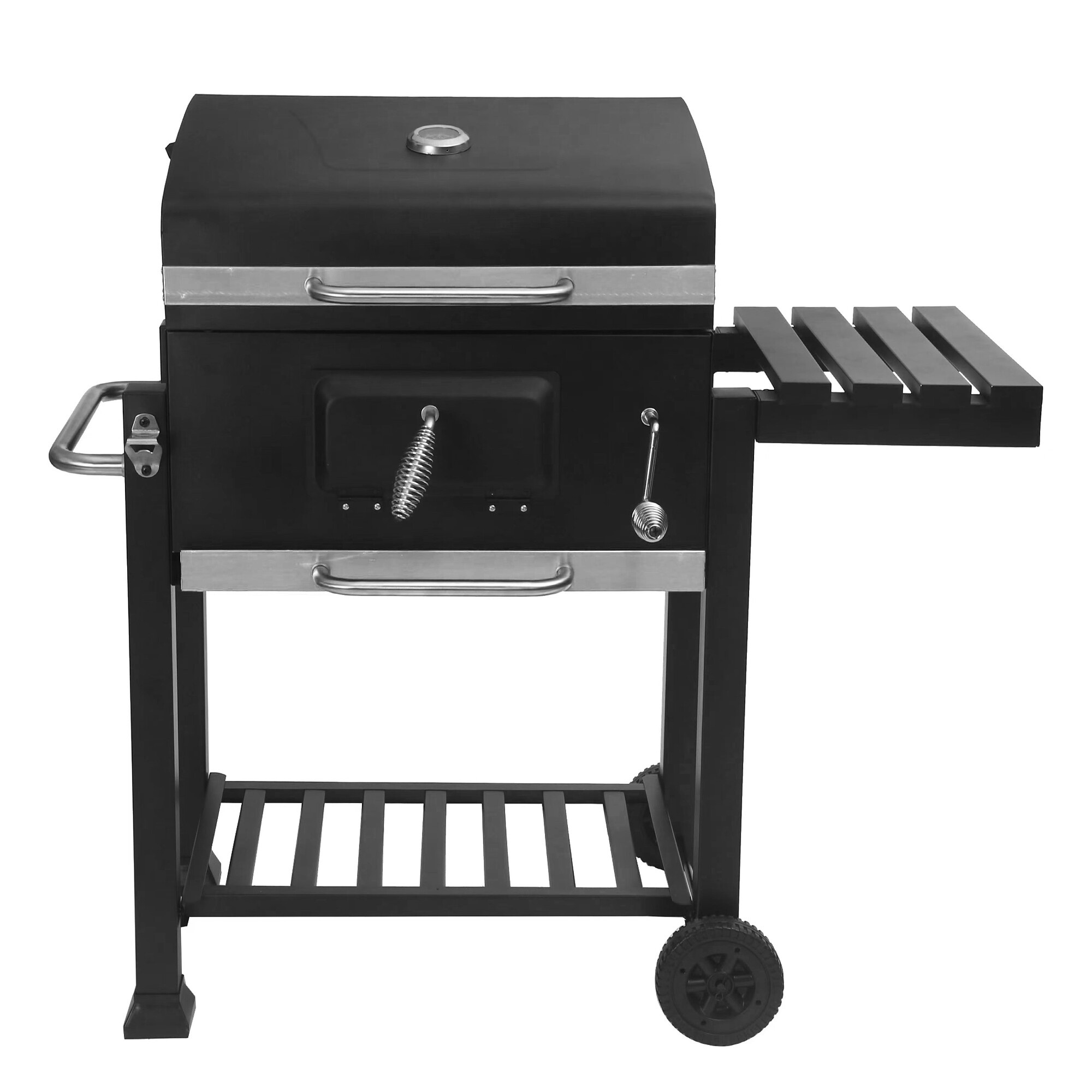 Vďaka dvom plastovým kolieskam je manipulácia s grilom jednoduchá a môžete ho ľahko premiestniť na potrebné miesto vo vašej záhrade či terase.Komfort vám doprajú aj odkladacie plochy, ktoré poskytujú dostatok miesta na prípravu a servírovanie pokrmov.