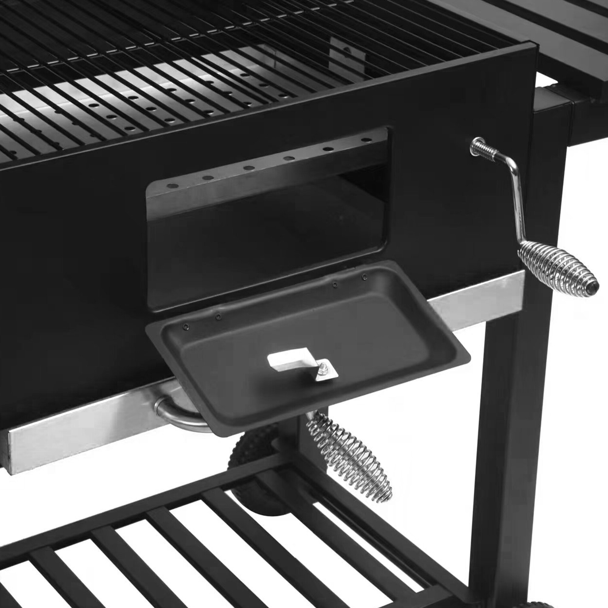 Pomocou kľuky si ľahko nastavíte výšku roštu, čo vám umožní presne regulovať intenzitu tepla.Tento gril môžete použiť aj bez veka ako klasický gril.