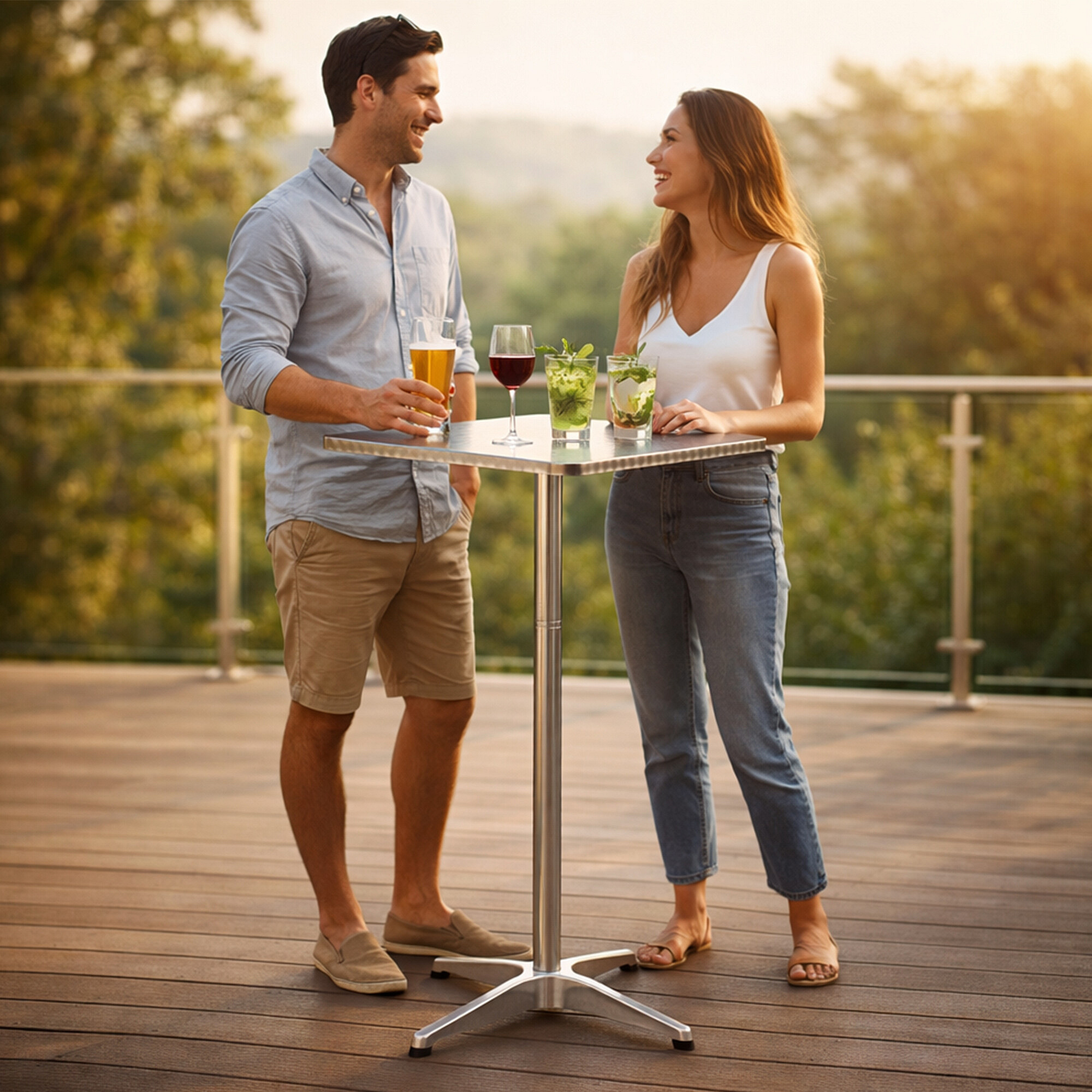 Záhradný stôl BISTRO s pevným hliníkovým rámom a nerezovou doskou v modernom dizajne, vhodný pre záhrady, terasy, kaviarne, altánky, balkóny či pláže.