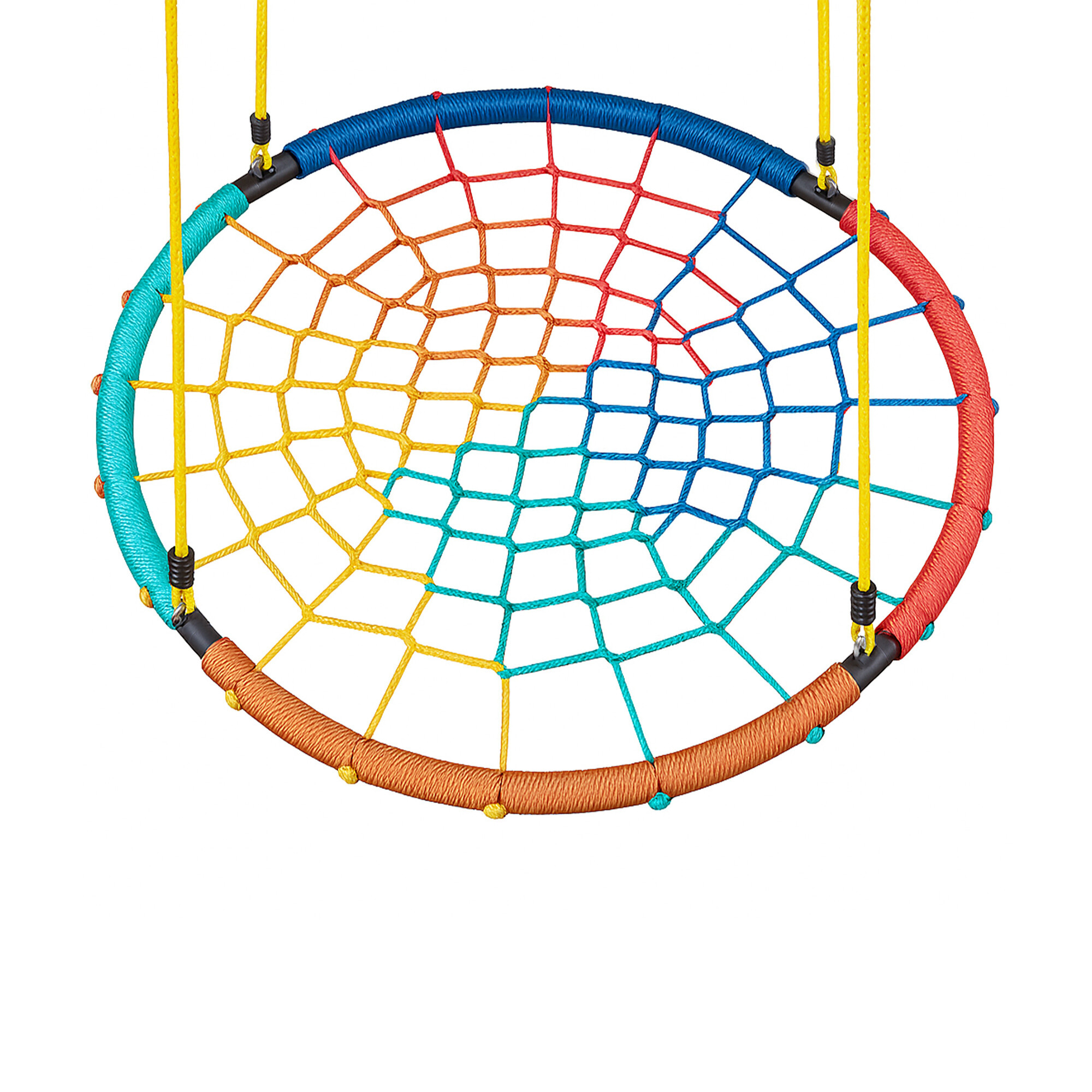 Sedadlo je potiahnuté lanovou sieťou, kovový rám je tiež chránený lanom.výšku hojdacieho kruhu možno plynule nastaviť pomocou závesných lán.