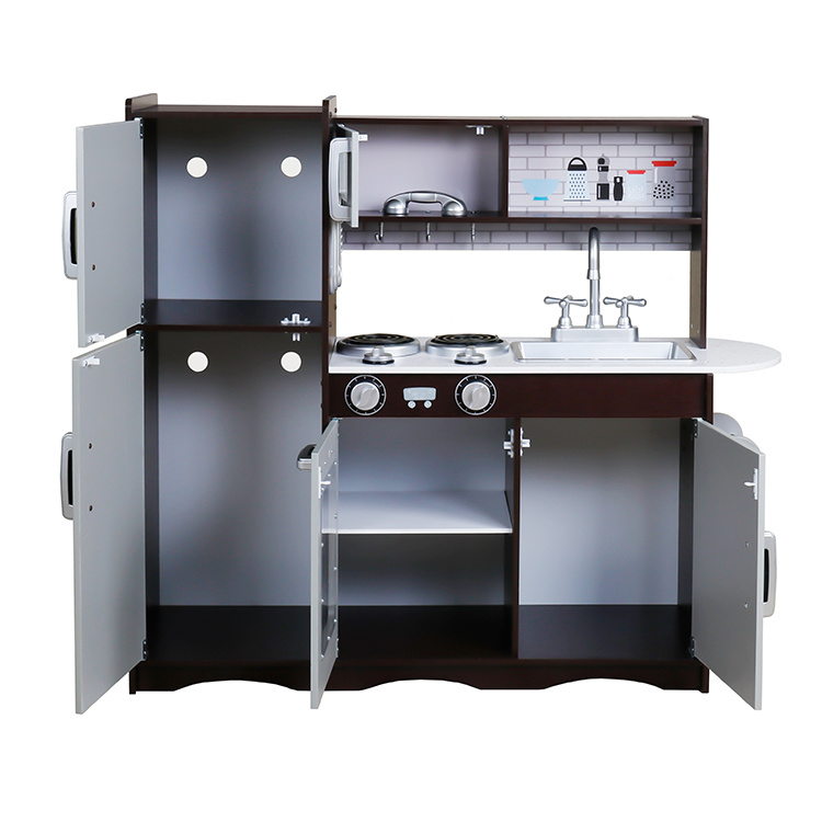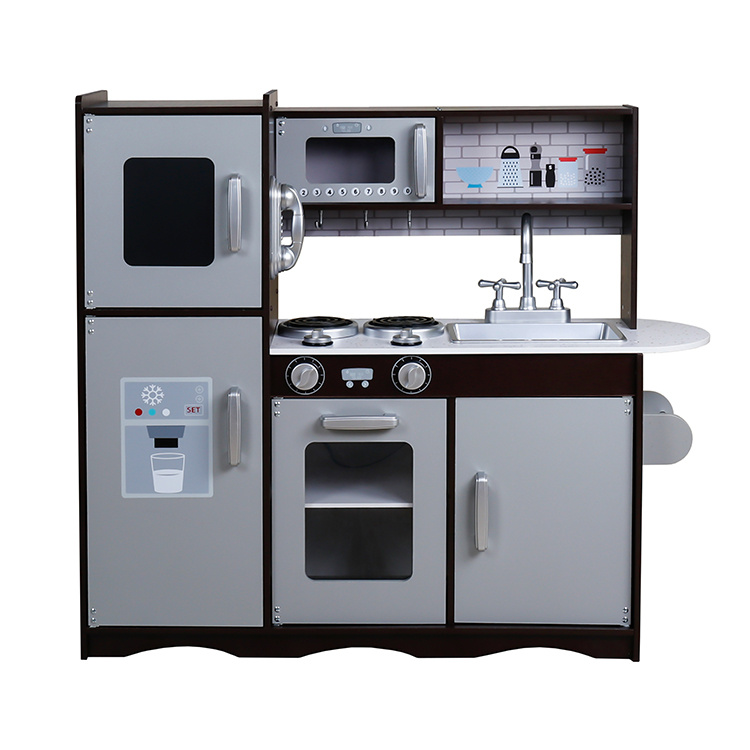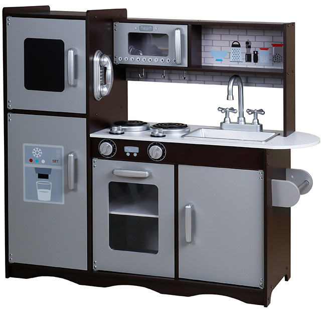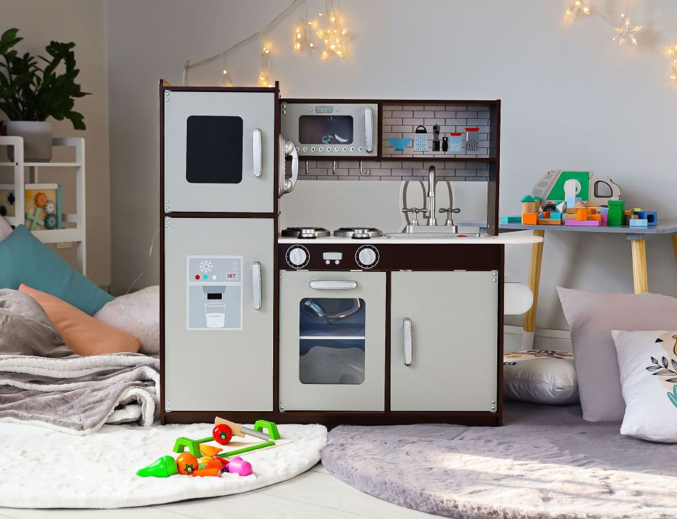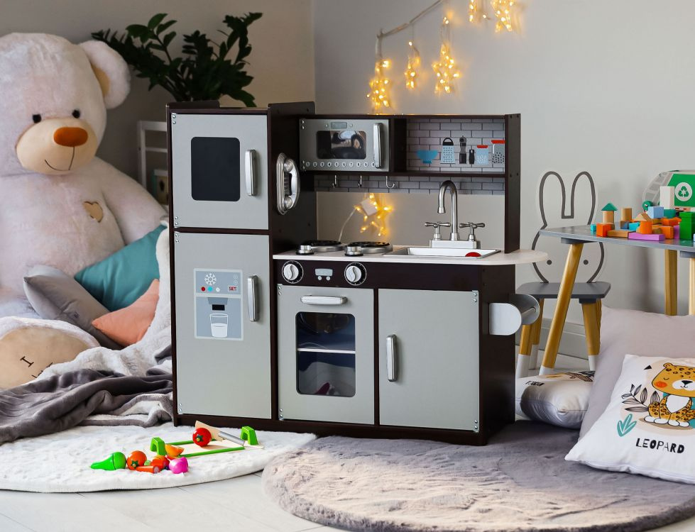 Drevená kuchynka je vybavená spotrebičmi ako je rúra na pečenie, mikrovlnná rúra, sporák s platňami, chladnička, nechýba ani drez na umývanie riadu.