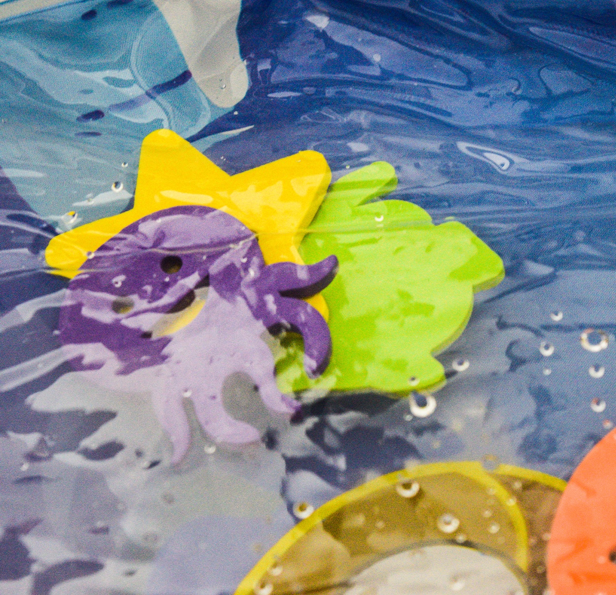 Jednoducho nafúknite okraj podložky a stred naplňte vodou alebo ju môžete nafúknuť.Vďaka vode vo vnútri sa začnú pohybovať prvky v tvare morských živočíchov, ktoré podnecujú dieťa k hre.