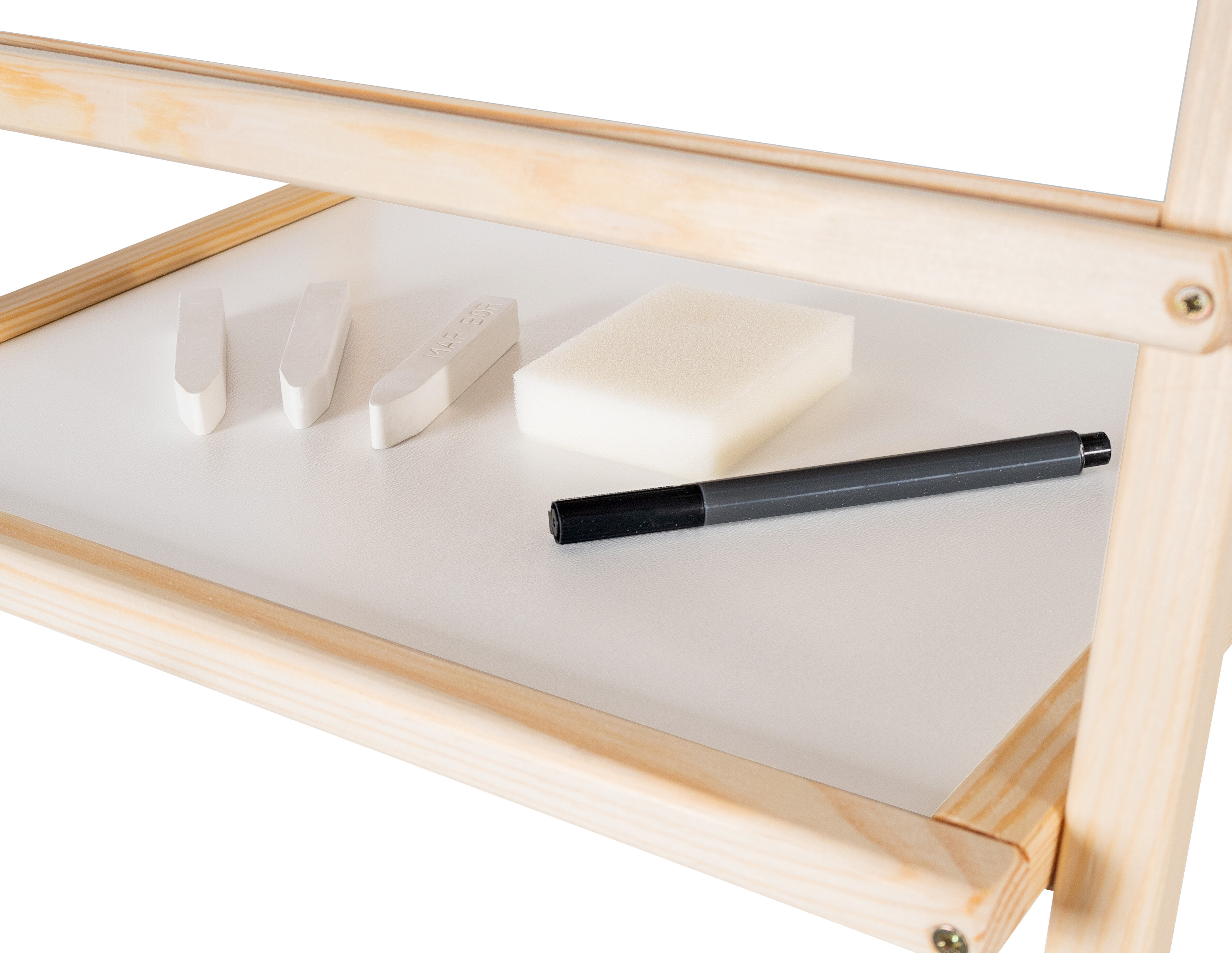- Sada obsahuje - 2 detské tabule, 3 kriedy, 1 fix, 1 rolku papiera (20 m), 1 hubku