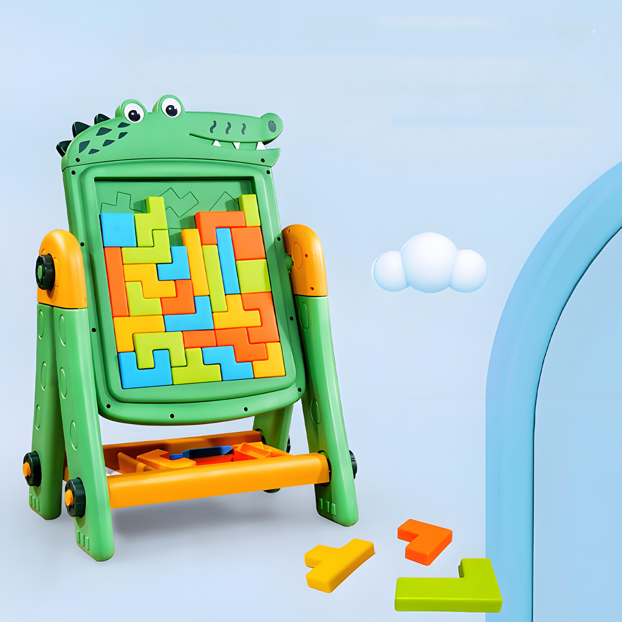 Druhá strana tabule je špeciálne navrhnutá na skladanie kociek. Deti si môžu stavať rôzne tvary a štruktúry, čo podporuje ich priestorovú predstavivosť a jemnú motoriku.