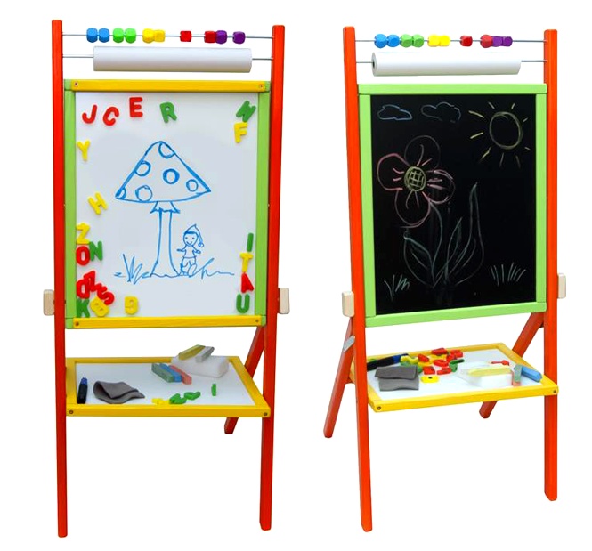 Deti môžu kresliť na čiernu stranu tabule klasickými kriedami a na druhú, bielu stranu, farebnými fixkami.