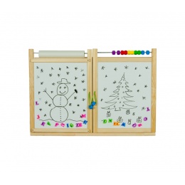 Na čiernu tabuľu môžu deti maľovať klasickými kriedami a na druhú, bielu, potom farebnými fixkami alebo na papier pastelkami.