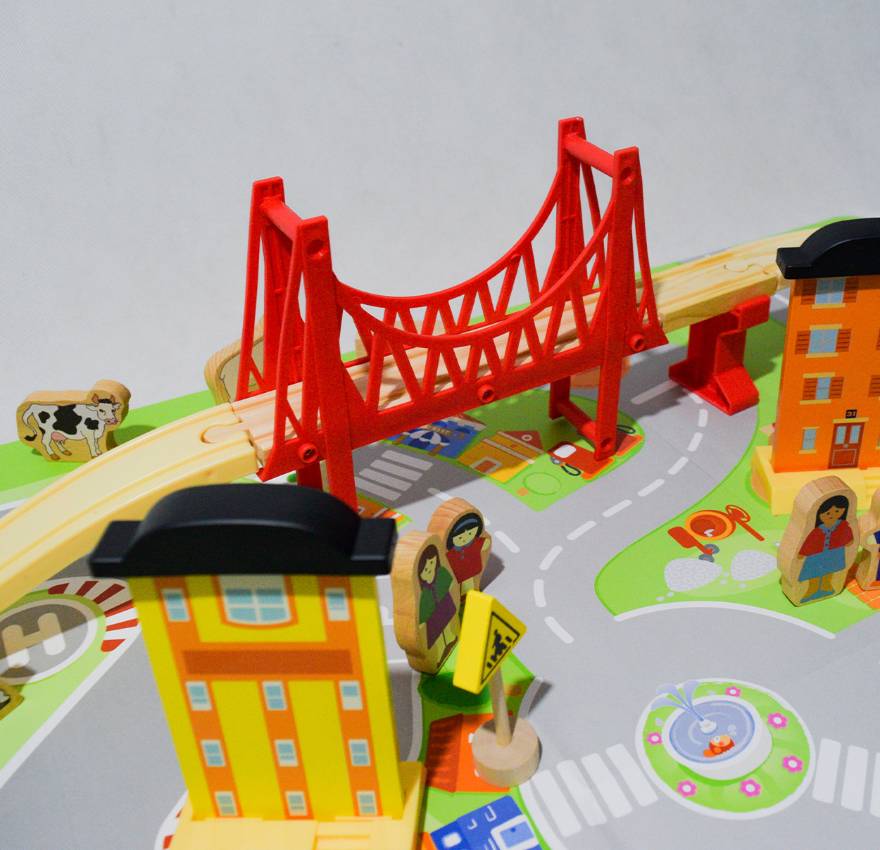 - Sada obsahuje - časti koľajníc s mostom, nákladný vlak, osobný vlak, autá, sadu stromov a značiek, zvieratá