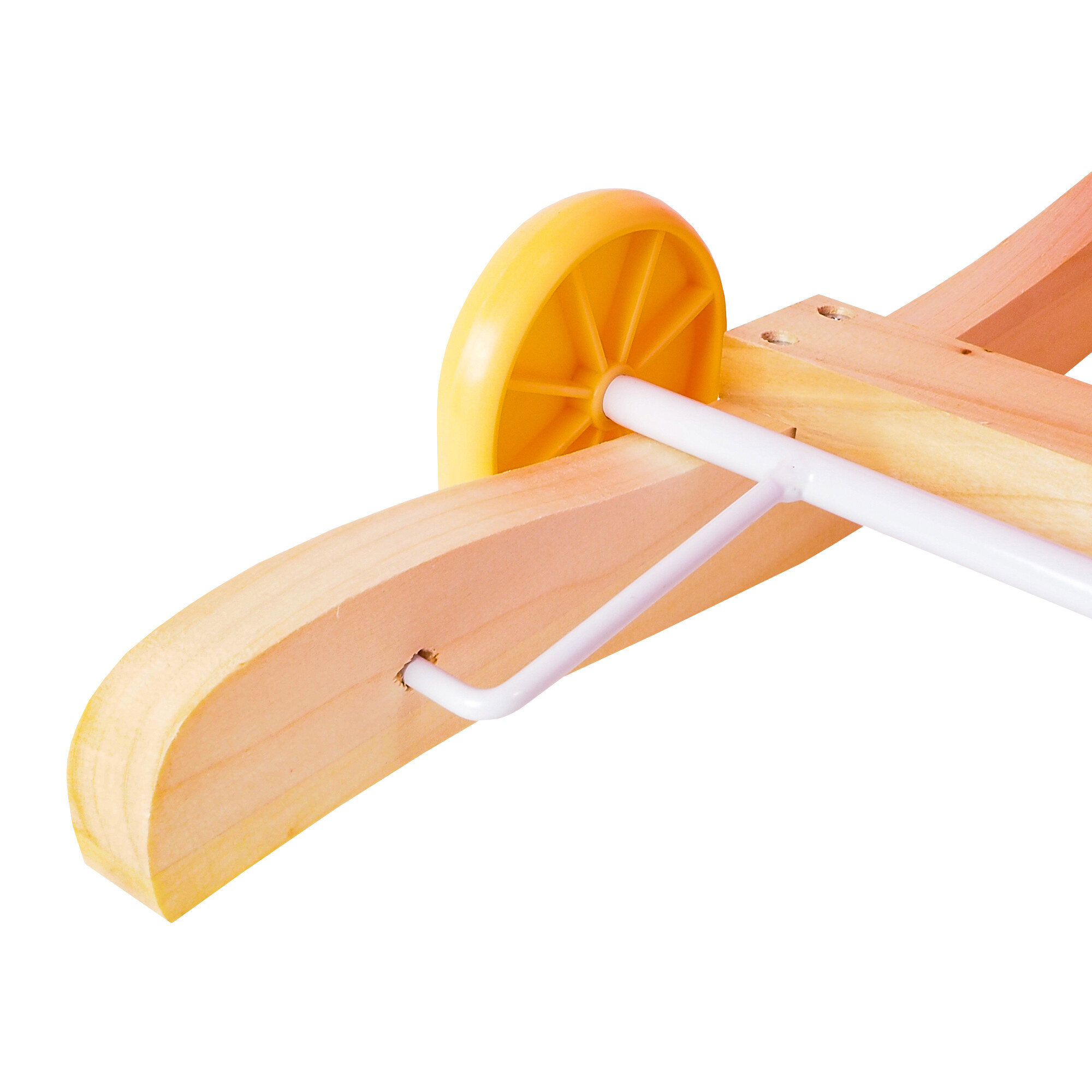 Pevné drevené lišty a rukoväte pomáhajú dieťaťu udržať rovnováhu. Preklopením jednoduchého mechanizmu na lištách vysuniete kolieska, čím v sekunde zmeníte hojdaciu hračku na jazdiaceho medvedíka.