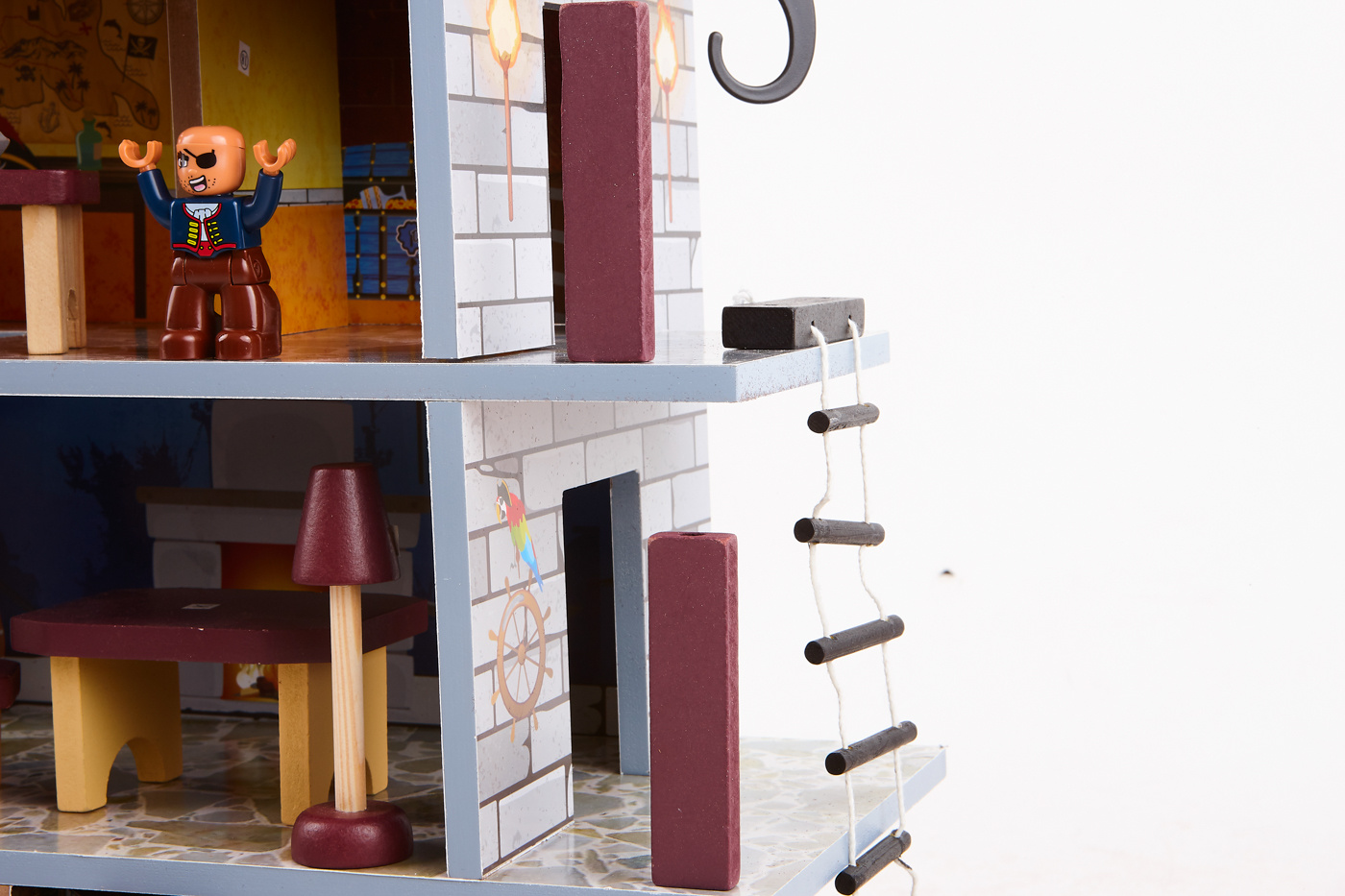Vyhliadková veža má tri úrovne podlaží, kde prvé a druhé poschodie je prepojené klasickým schodiskom a druhé s tretím točitými schodmi. V pevnosti sa nachádza väzenská cela, prístav a na streche je strážna veža s pirátskou vlajkou a delom.