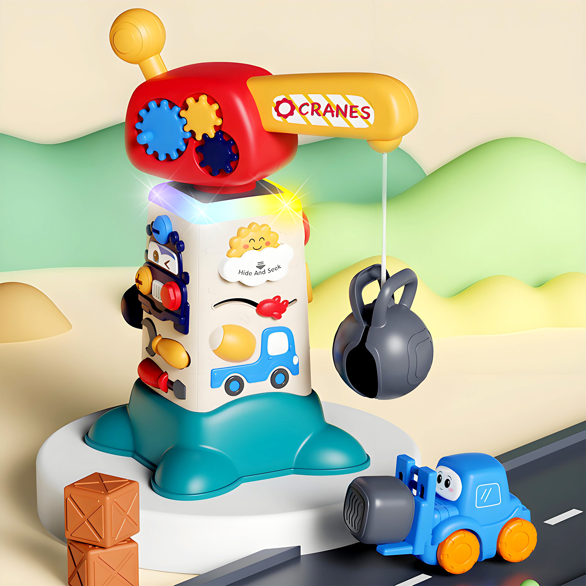 Interaktívny žeriav je vybavený mnohými funkciami, ktoré podporujú rozvoj detí. Každá zo štyroch strán žeriavu ponúka jedinečné aktivity, ktoré stimulujú rôzne zmysly a zručnosti.