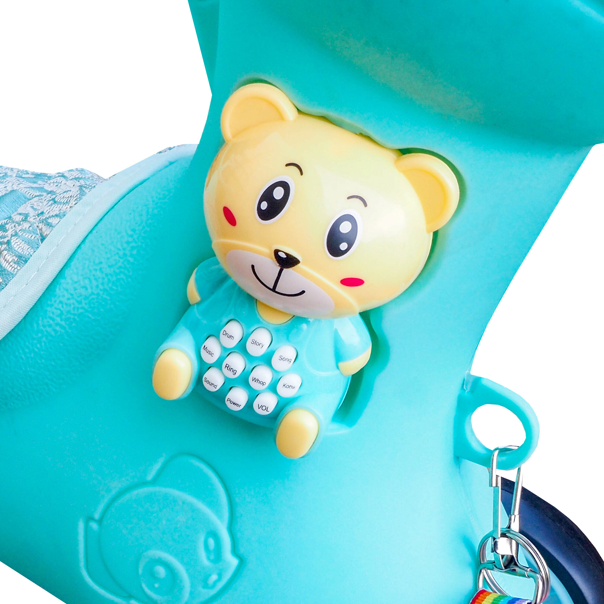 Na krku koníka sa nachádza interaktívny medvedík, ktorý vydáva rôzne zvuky a melódie.