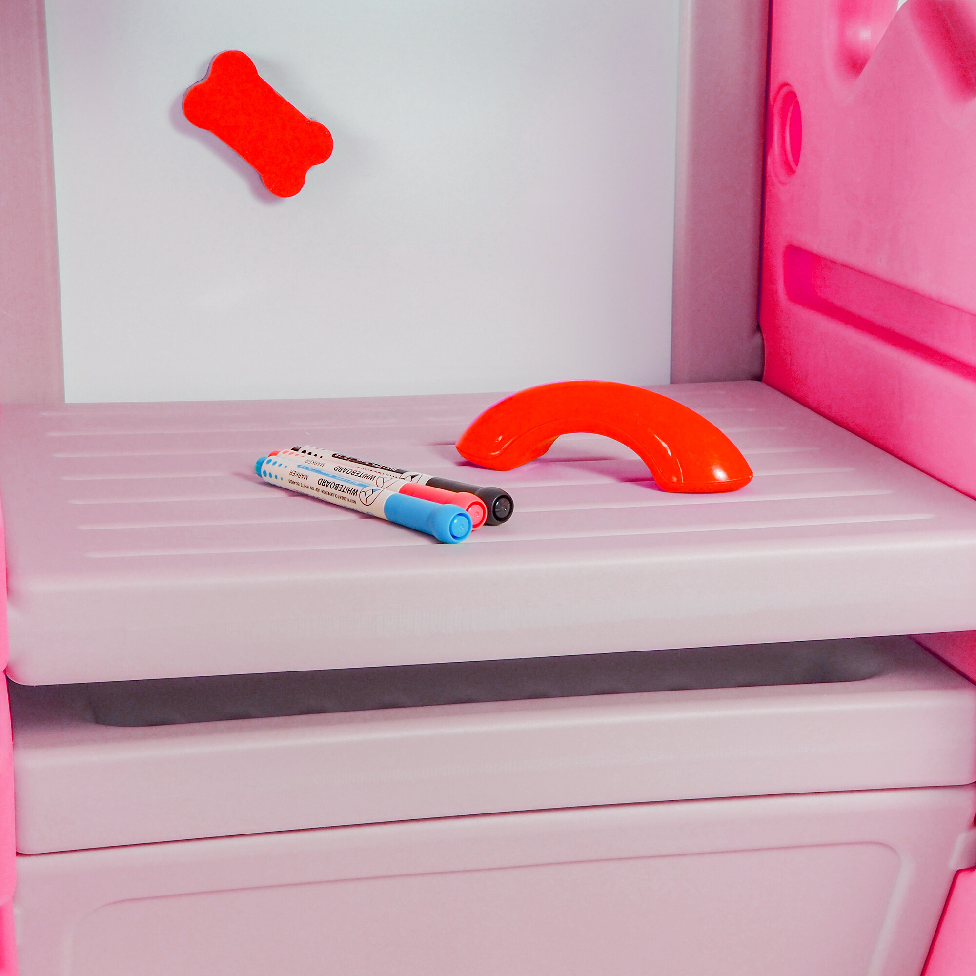 Jedným z hlavných prvkov tejto učebnej veže je tabuľa na kreslenie, ktorá poskytuje deťom priestor na vyjadrenie ich kreativity. Tabuľa je dodávaná s tromi fixkami, ktoré umožňujú deťom kresliť, písať a mazať podľa ľubovôle. Táto aktivita nielenže podporuje jemnú motoriku, ale tiež rozvíja ich predstavivosť.