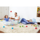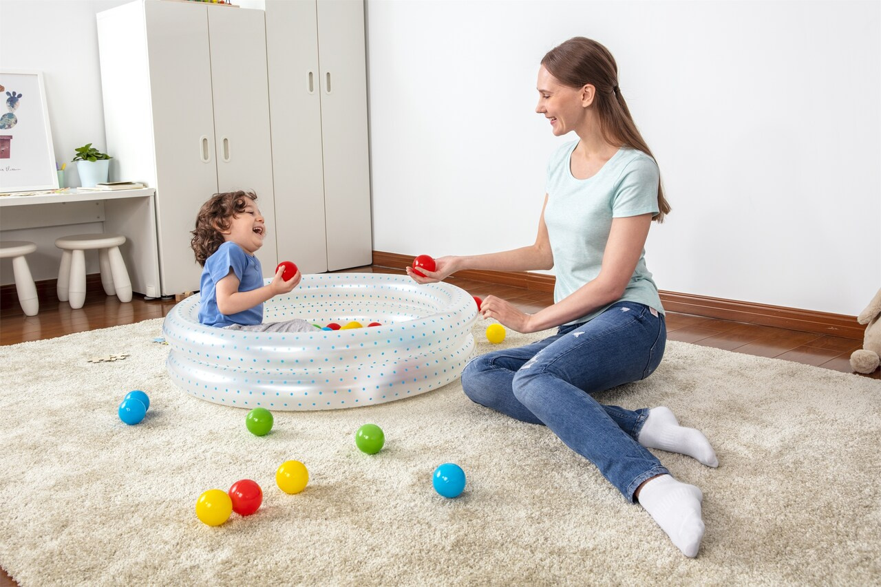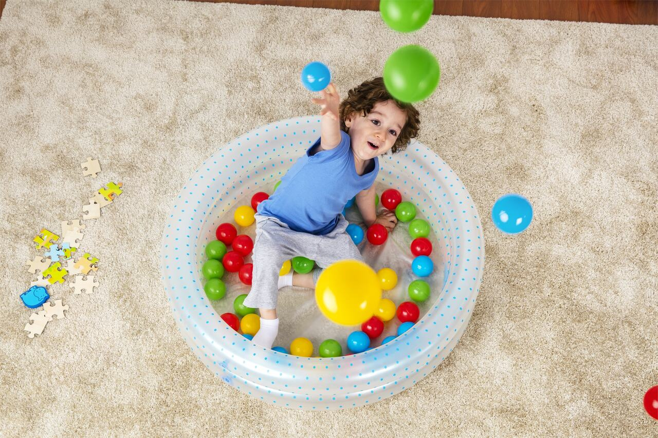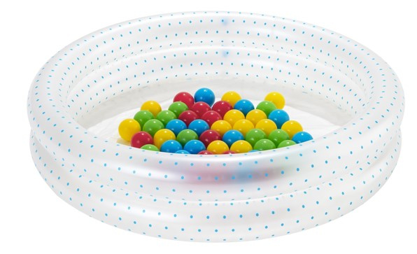 * Bezpečnostné ventily* Predom testovaný, odolný vinylový materiál* 2 rovné kolieska* súčasťou balenia je 50 loptičiek,* 4 ďalšie hračky,* Opravná záplata súčasťou balenia* Objem: 73 litrov (19 galónov)