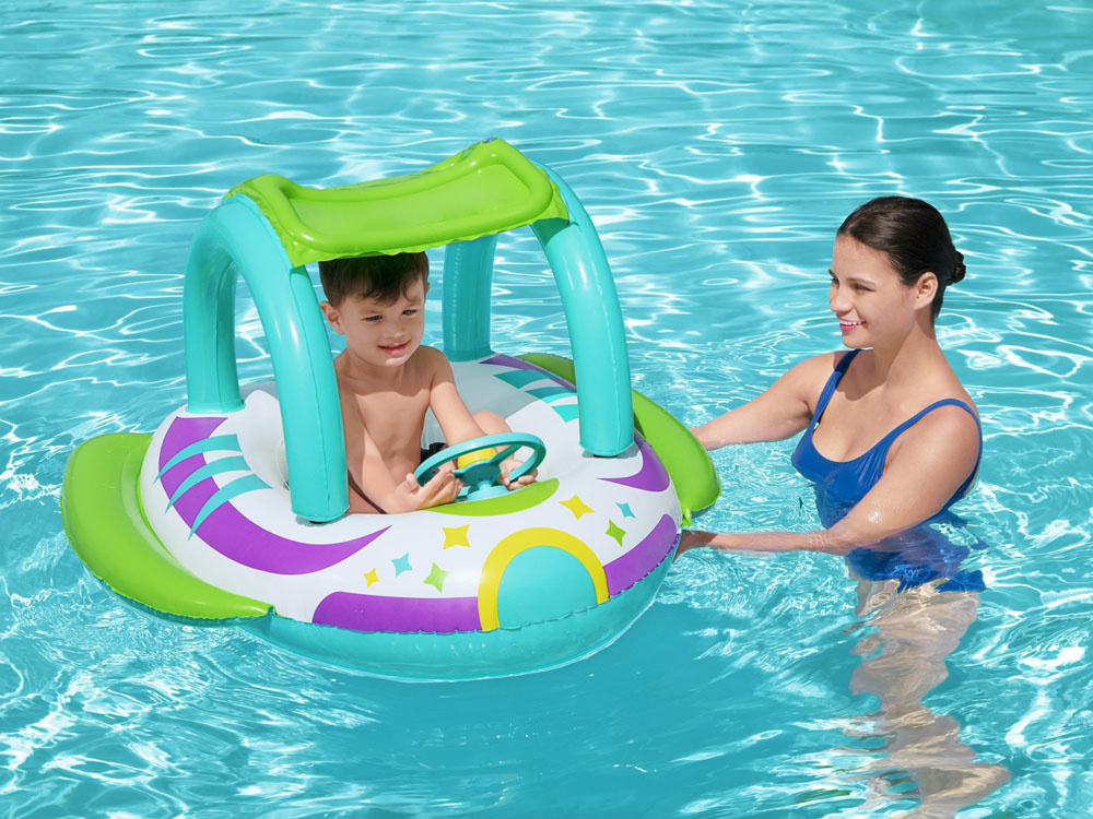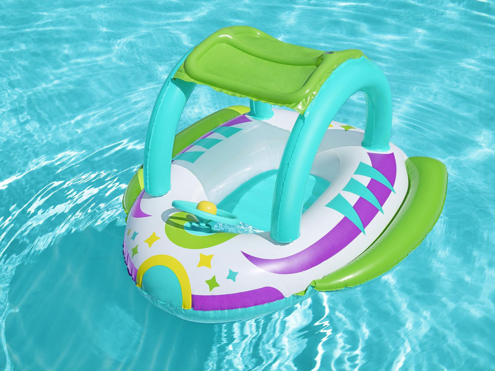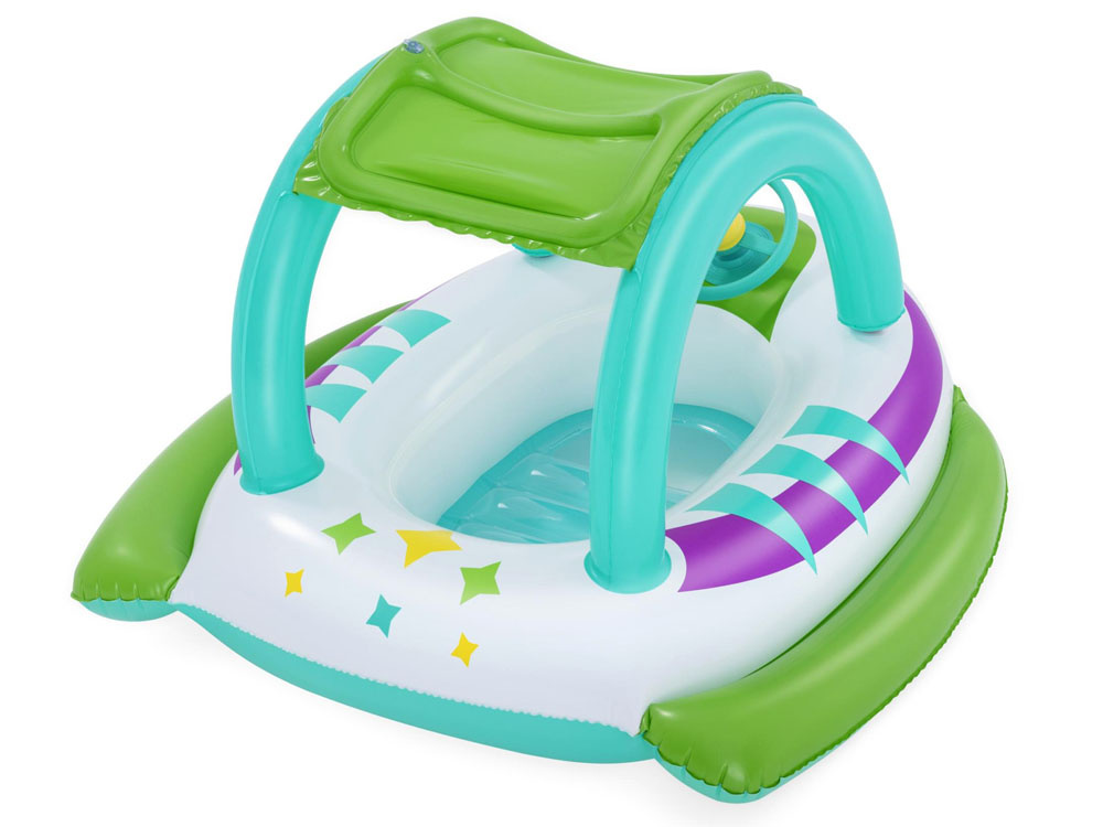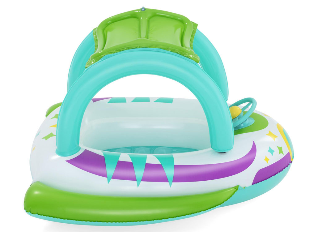 Nafukovací čln v tvare lode s farebnou vesmírnou grafikou je ponuka Bestway® Space Splash™ pre deti od 3 rokov. Pontón bol špeciálne navrhnutý pre deti, ktoré si ešte len zvykajú na vodu a nedokážu sa v nej udržať samy. Pontón má odnímateľnú slnečnú striešku UV Careful™, ktorá poskytuje ochranu pred slnkom pre vaše dieťa a trochu tieňa počas horúcich dní. Tienidlo je pripevnené pomocou suchého zipsu, ktorý umožňuje jednoduchú montáž a demontáž tienidla. Ďalšou vlastnosťou pontónu je nafukovacie dno, ktoré dieťaťu umožní cítiť sa pohodlne počas plávania na vode. V spodnej časti člna je aj pozorovacie okienko, aby si váš malý kapitán mohol vychutnať pohľad pod vodu, a zabudovaný volant s klaksónom poskytne ďalšiu zábavu. Čln je vyrobený z odolného vinylu a prinesie každému dieťaťu veľa zábavy vo vode počas horúcich dní.