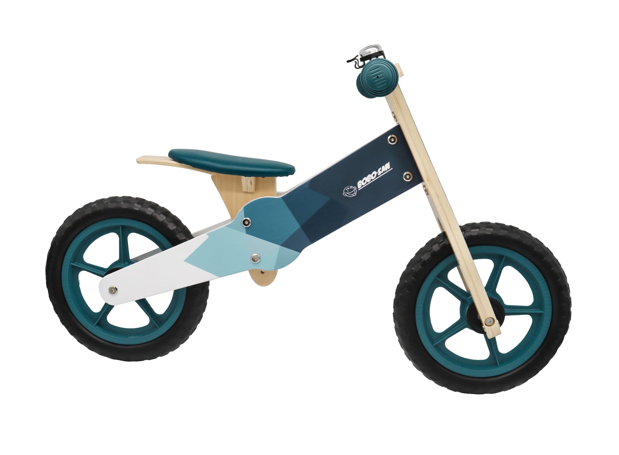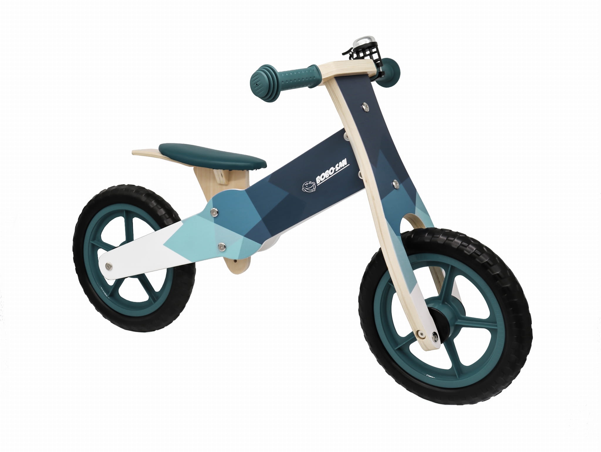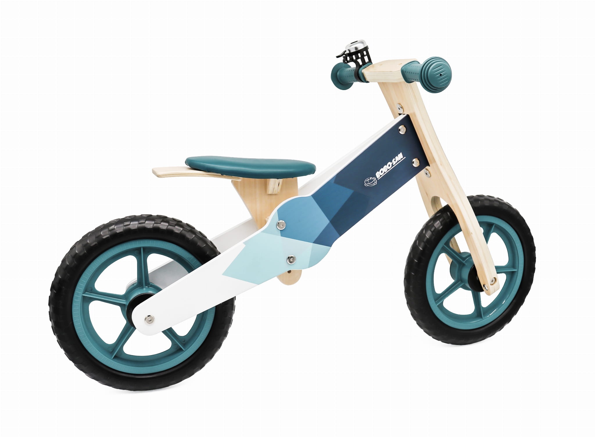 Detský drevený bicykel s otočnými riadidlami, ergonomicky tvarovaným a výškovo nastaviteľným sedadlom.