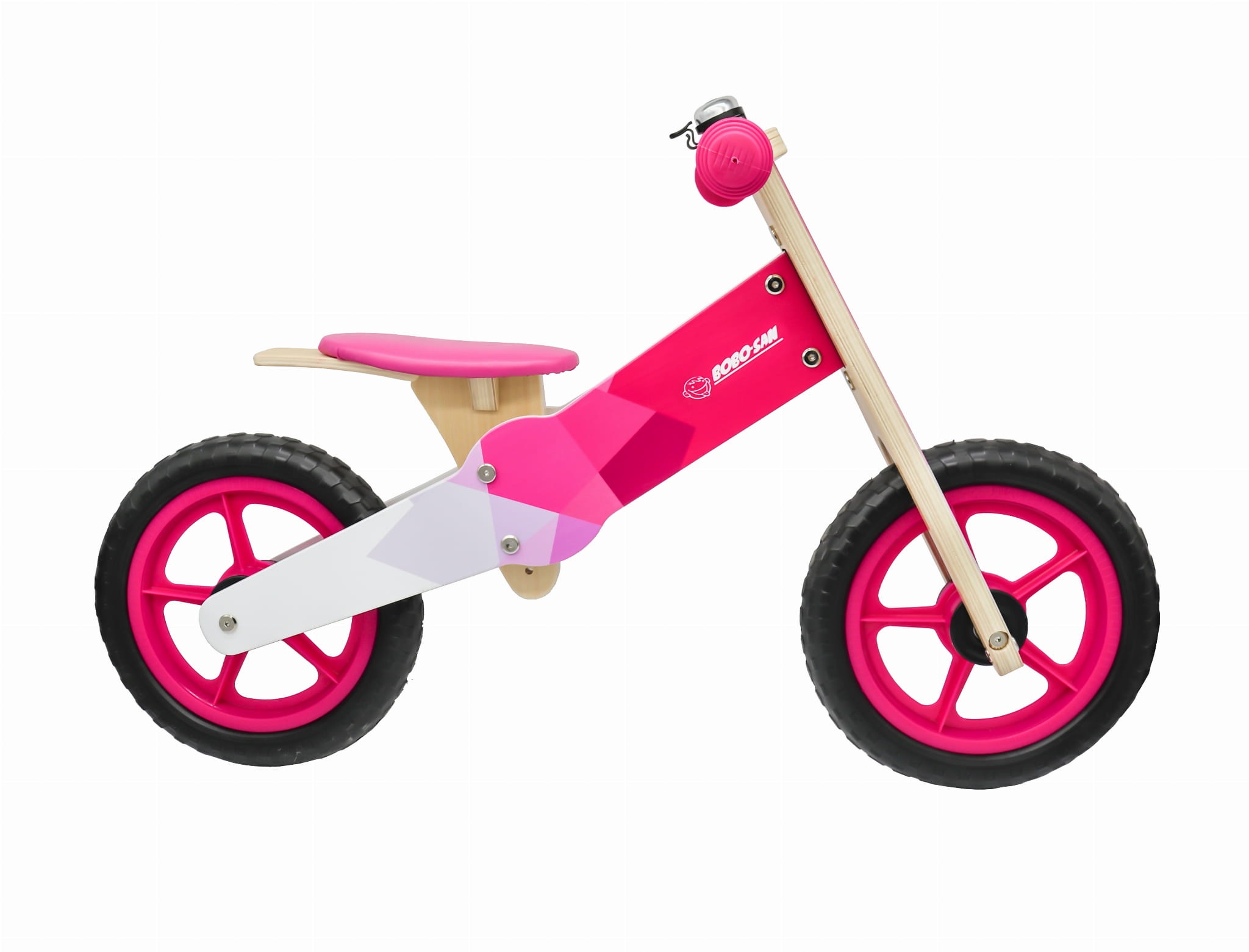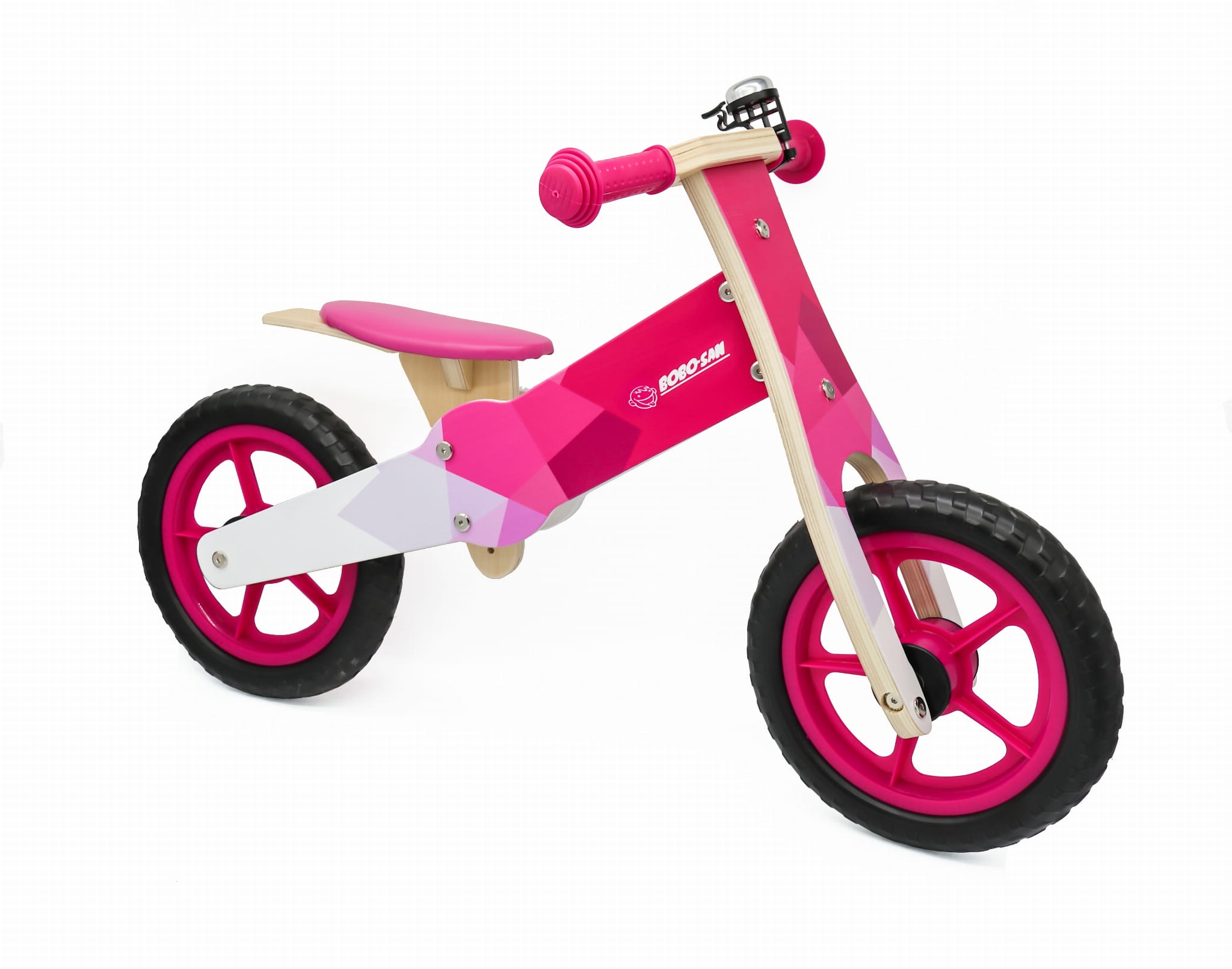 Detský drevený bicykel s otočnými riadidlami, ergonomicky tvarovaným a výškovo nastaviteľným sedadlom.