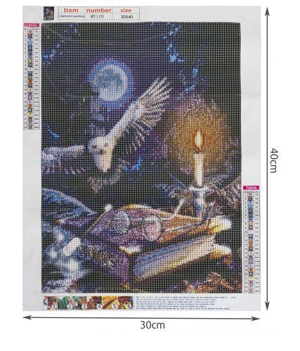 šPECIFIKÁCIE- vzor: sova; plátno potiahnuté lepidlom: áno; súčasťou balenia: farebné diamanty, aplikátor, suché lepidlo, nádoba; veľkosť: 30x40 cm; veľkosť obrazu: 25x35cm; hmotnosť: 0,1 kg; hmotnosť v balení: 0,103 kg