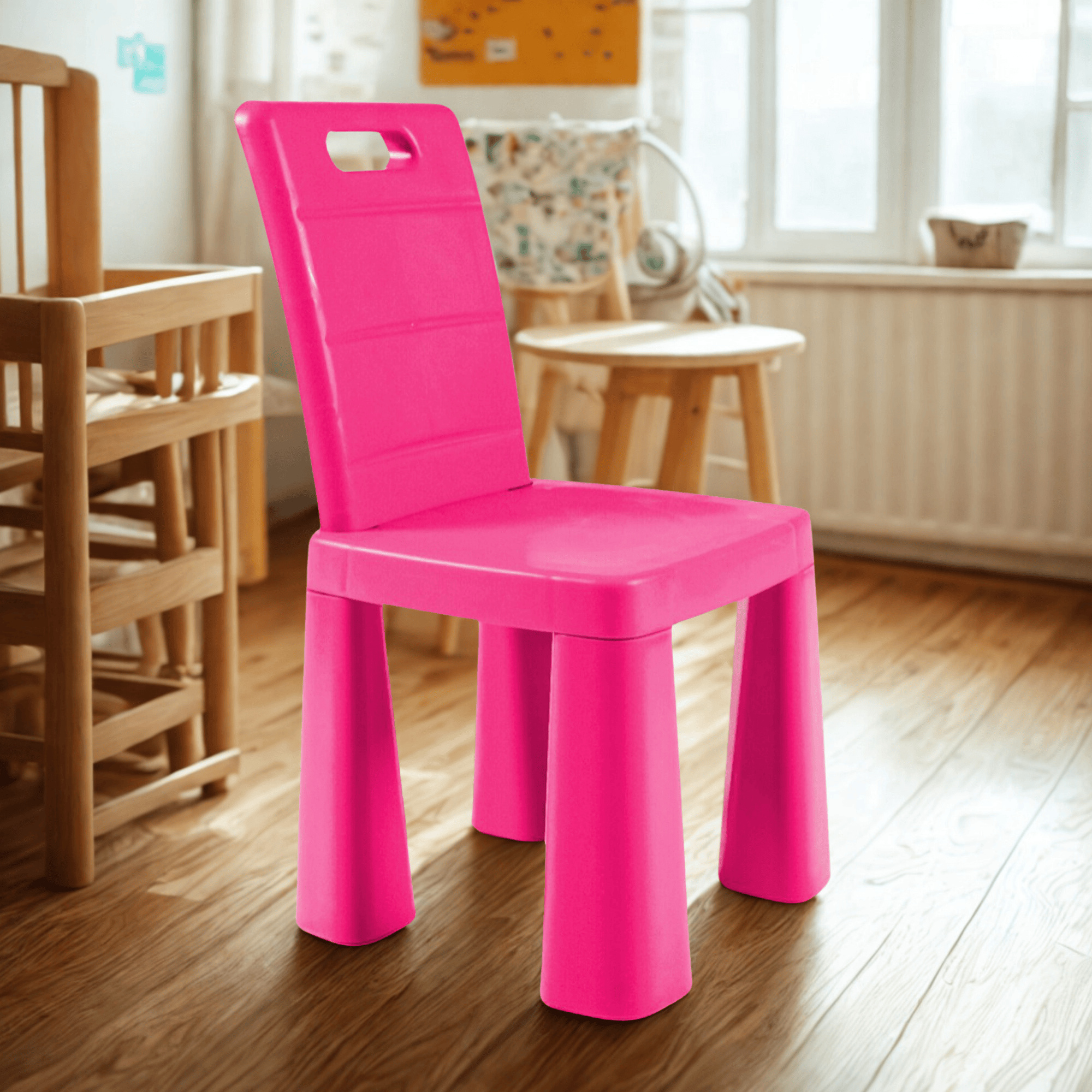 Jedným z praktických prvkov tejto stoličky je otvor na operadle, ktorý umožňuje jednoduchú manipuláciu. Deti aj dospelí môžu stoličku ľahko prenášať z miesta na miesto, čo je ideálne pre rýchle zmeny v usporiadaní priestoru alebo pri upratovaní.