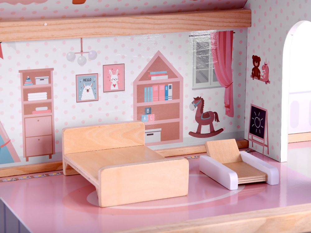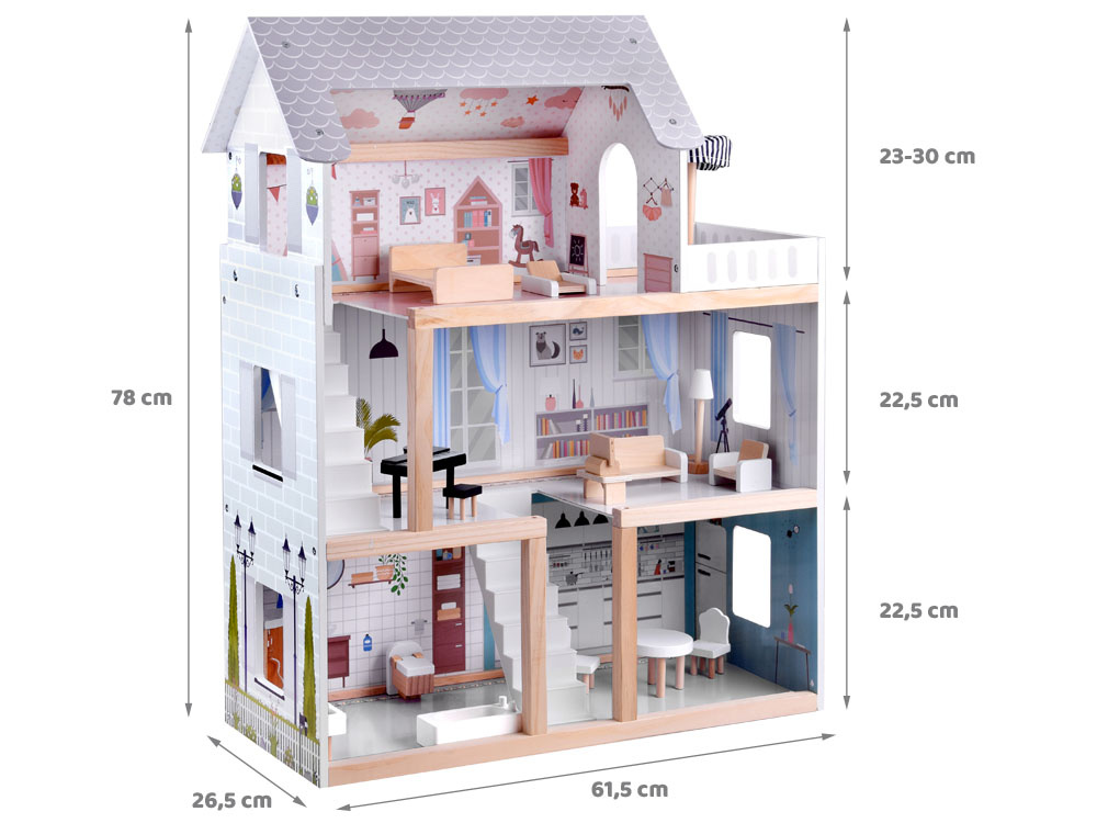 Tento štýlový domček pre bábiky s príbehom a nábytkom poskytne každej dievčine skvelú zábavu. Domček je veľmi pekne vyrobený, poteší každé dieťa a hodí sa do každej detskej izby. Dom má 3 podlažia, z ktorých každé je elegantne a štýlovo zariadené. Domček pre bábiky je vybavený všetkým nábytkom potrebným na pohodlné fungovanie. Povrchová úprava domu je veľmi nápadná, hra s takýmto domom bude pokračovať donekonečna. Hračka je určená na vlastné zostavenie. Zostavenie domčeka trvá maximálne 30 minút. Je veľmi jednoduchý a intuitívny. Dom je zabalený v kartónovej krabici, ktorá je vo vnútri chránená polystyrénom pre bezpečnú prepravu.