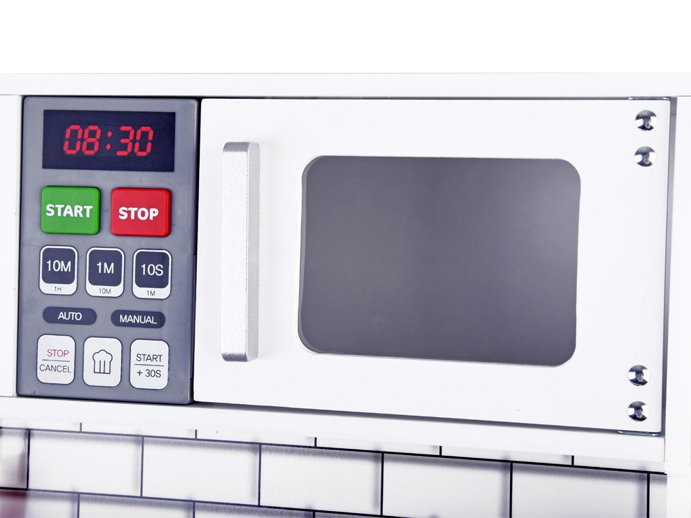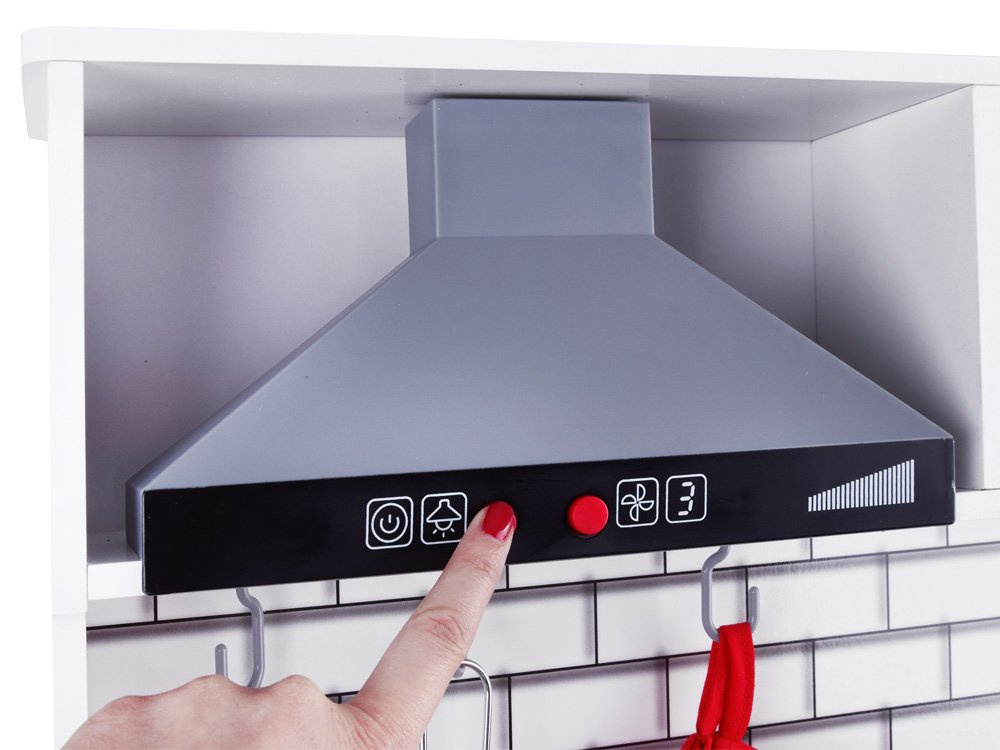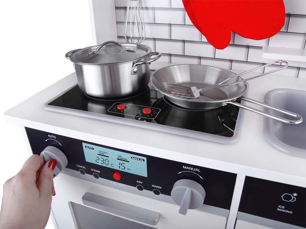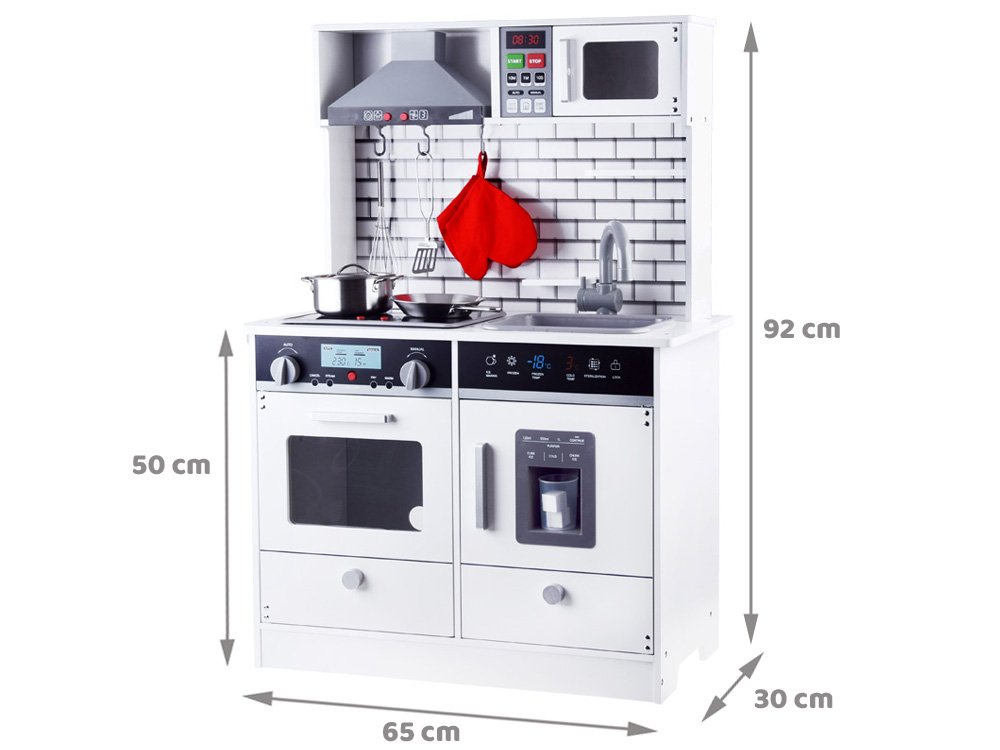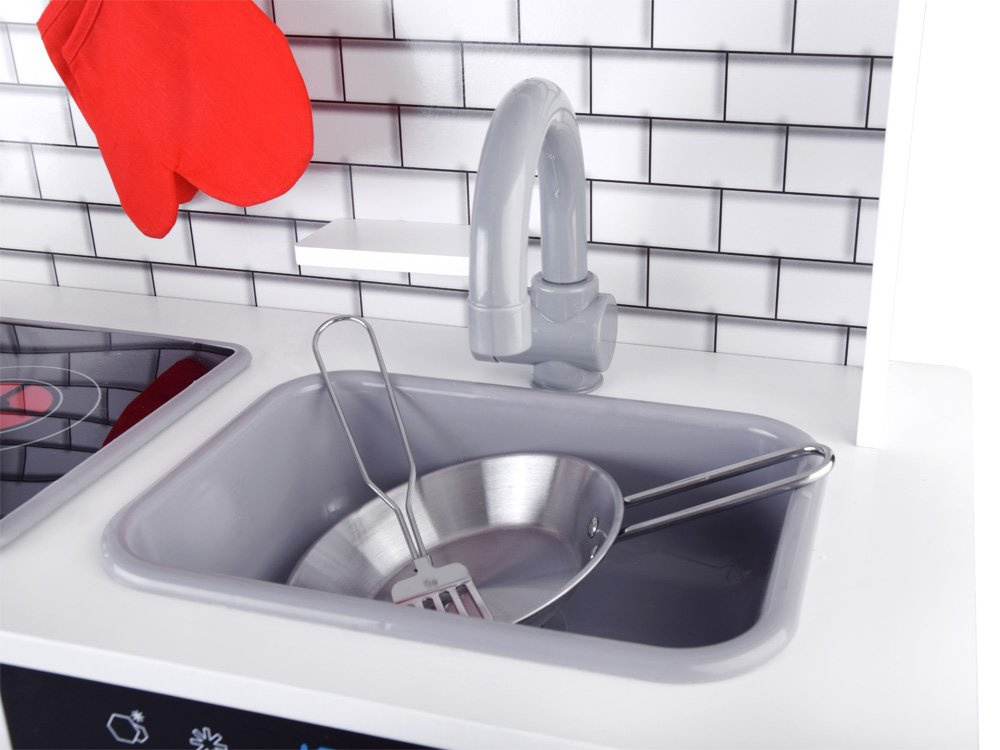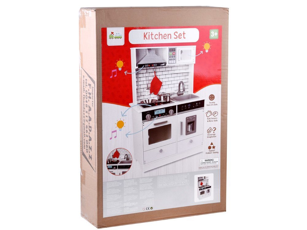 Veľká drevená kuchynka so svetelnými a zvukovými efektmi a doplnkami pomaly prinúti každého malého kuchára, aby si pripravil chutné jedlo. Súprava je veľmi pôsobivo vyrobená a obsahuje všetky základné domáce spotrebiče. Nábytok vyrobený z MDF, natretý bezpečnostnou farbou vo vkusnom škandinávskom štýle. Bohato zariadená kuchyňa v bielej farbe s módnymi tehličkami sa dokonale hodí do každej detskej izby, kuchynského kútika.