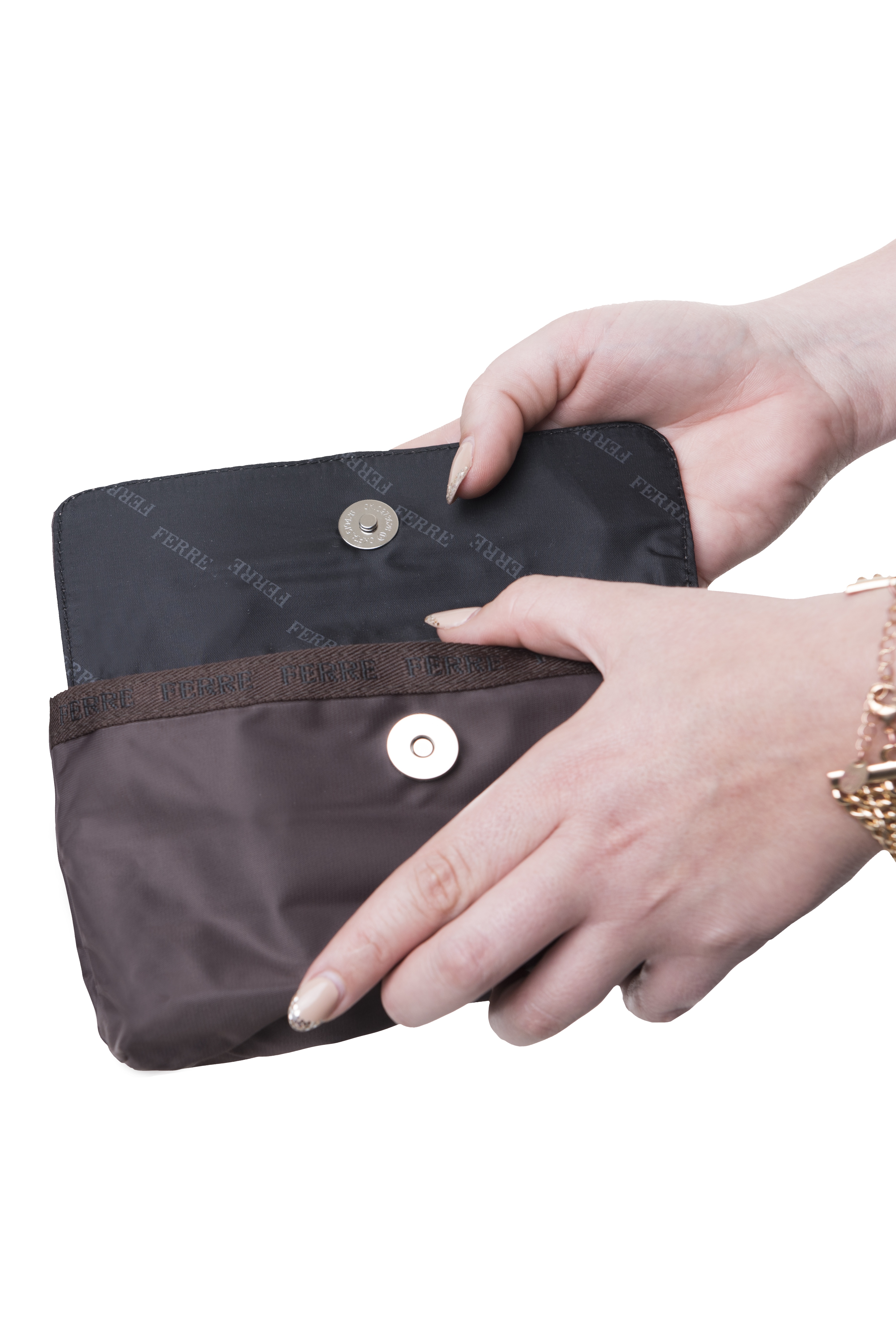 Praktická kozmetická taška GF Ferre so zapínaním na cvočky je vyrobená z ľahkého materiálu, ktorý sa ľahko udržiava.