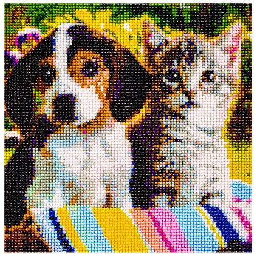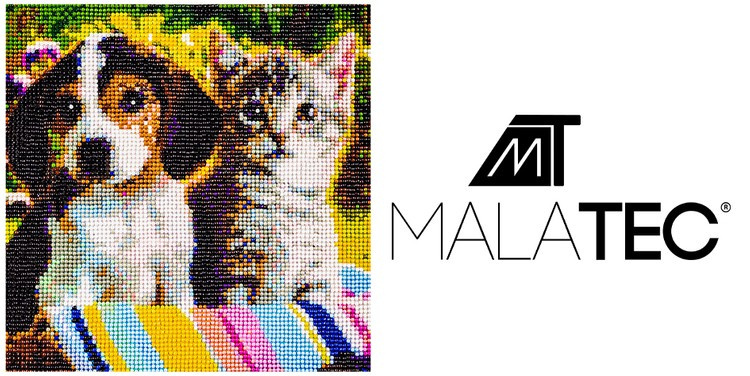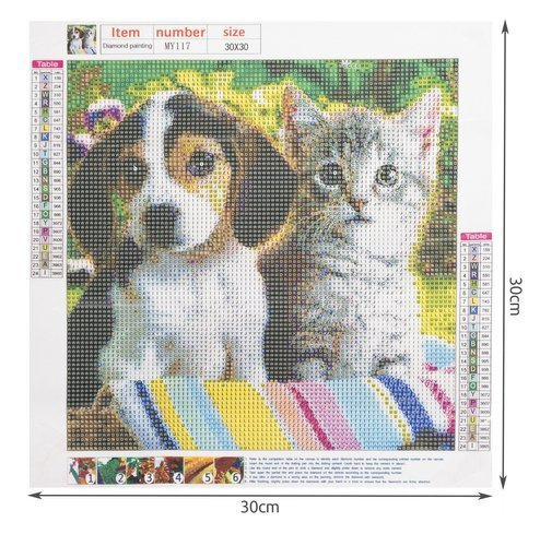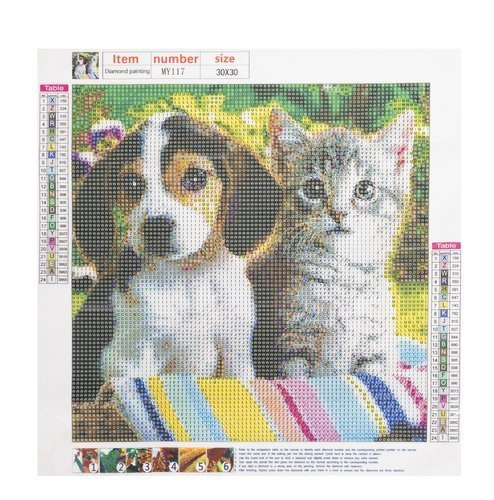 šPECIFIKÁCIE- vzor pes a mačka; plátno pokryté lepiacou vrstvou: áno; sada obsahuje: farebné diamanty, aplikátor, suché lepidlo, kontajner, veľkosť: 30x30 cm; veľkosť obrazu: 25x25cm; hmotnosť: 0,1 kg; hmotnosť v balení: 0,103 kg