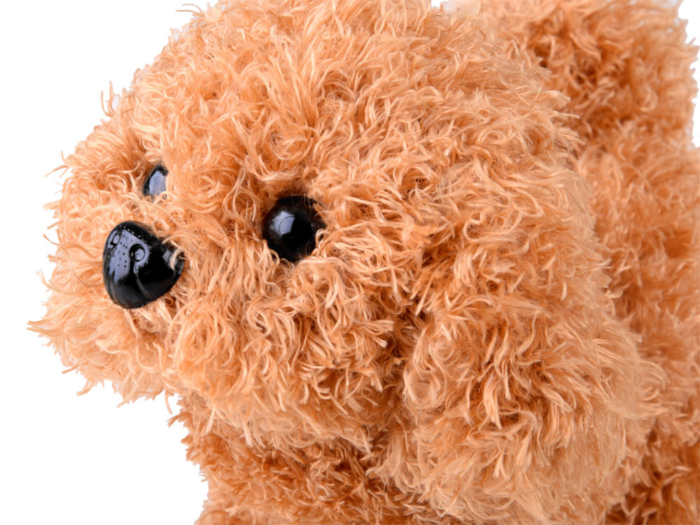 - plyšový pes karamelovej farby s kučeravou srsťou, čiernymi očami a nosom