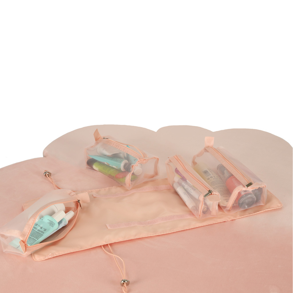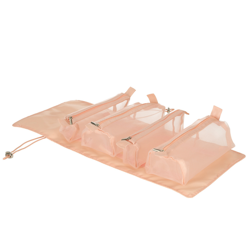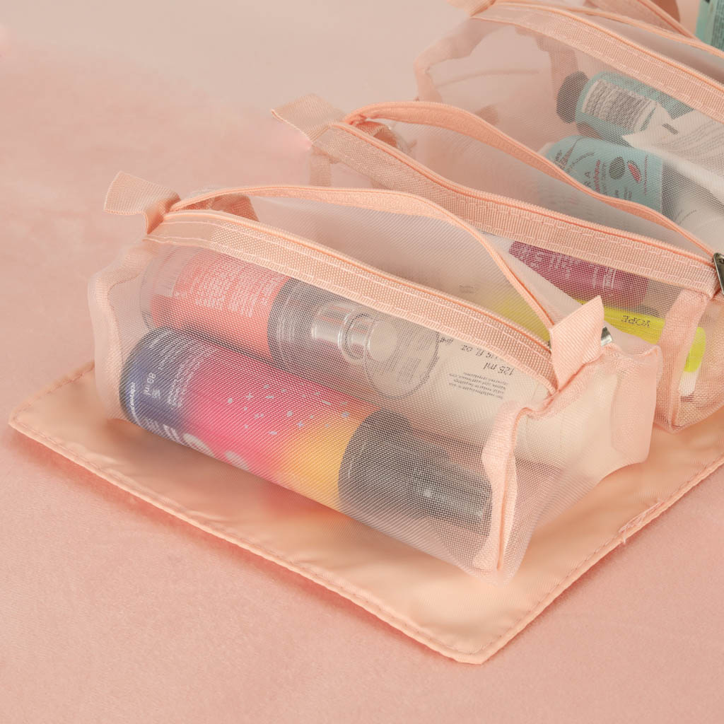 Ružová kozmetická taštička na cesty - možno zrolovať, aby v batožine zaberala menej miesta. Má štyri priehradky, ktoré možno vybrať. Steny priehradiek sú vyrobené zo sieťoviny, ktorá uľahčuje hľadanie výrobkov a tiež zabezpečuje dobré odvetrávanie mokrých obalov.