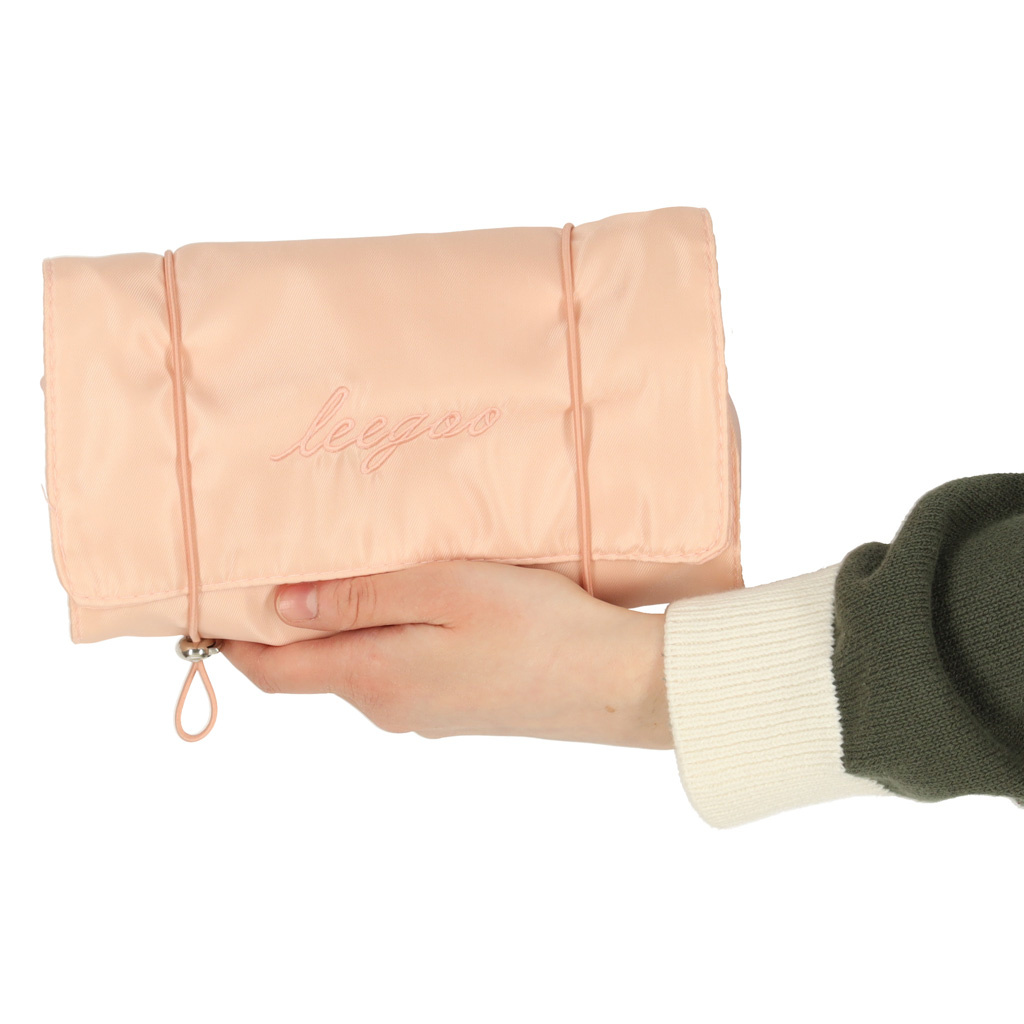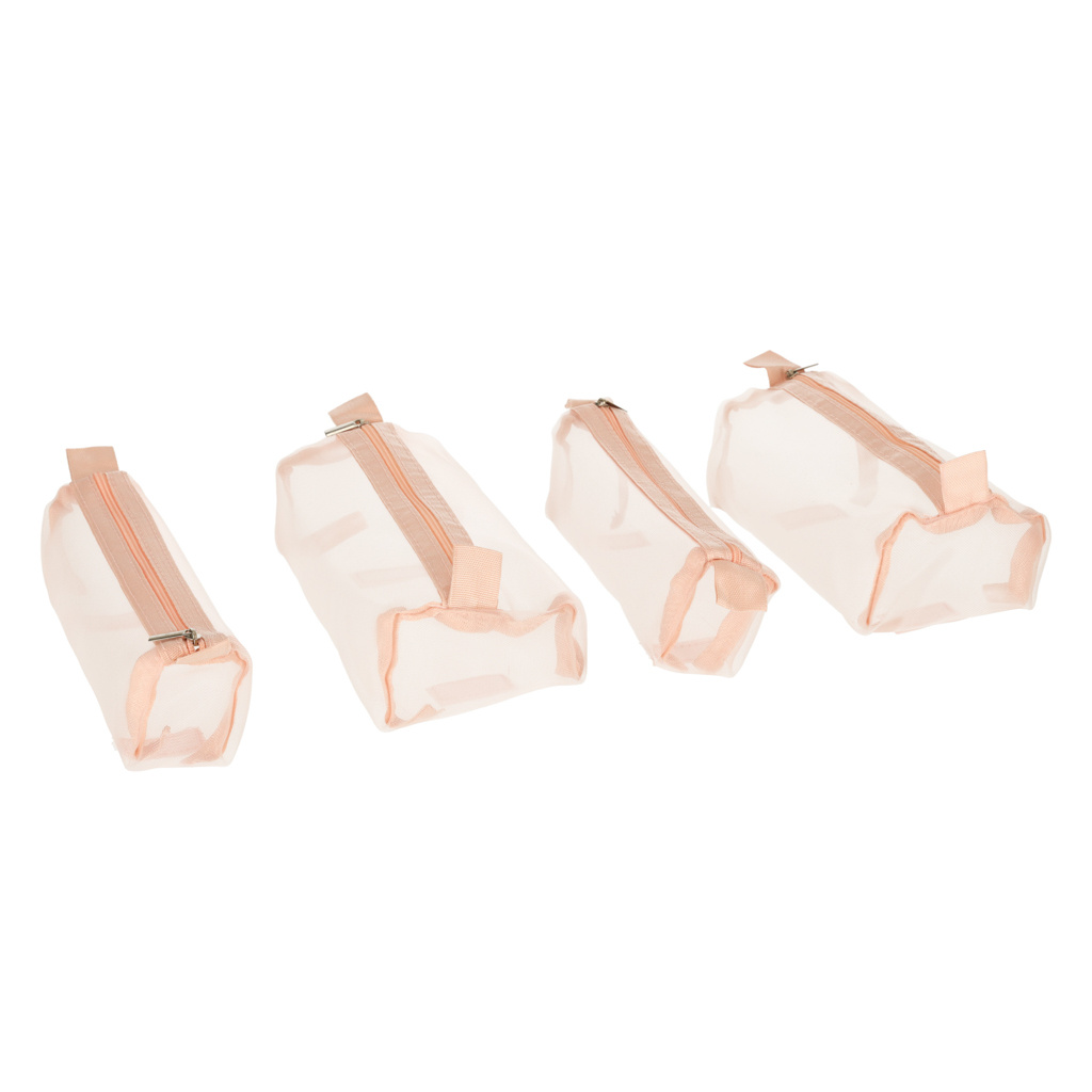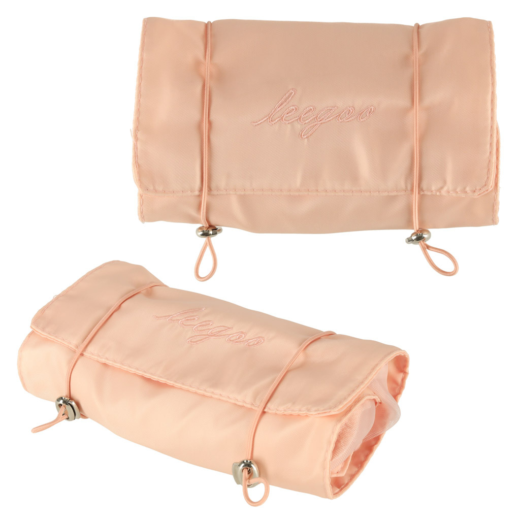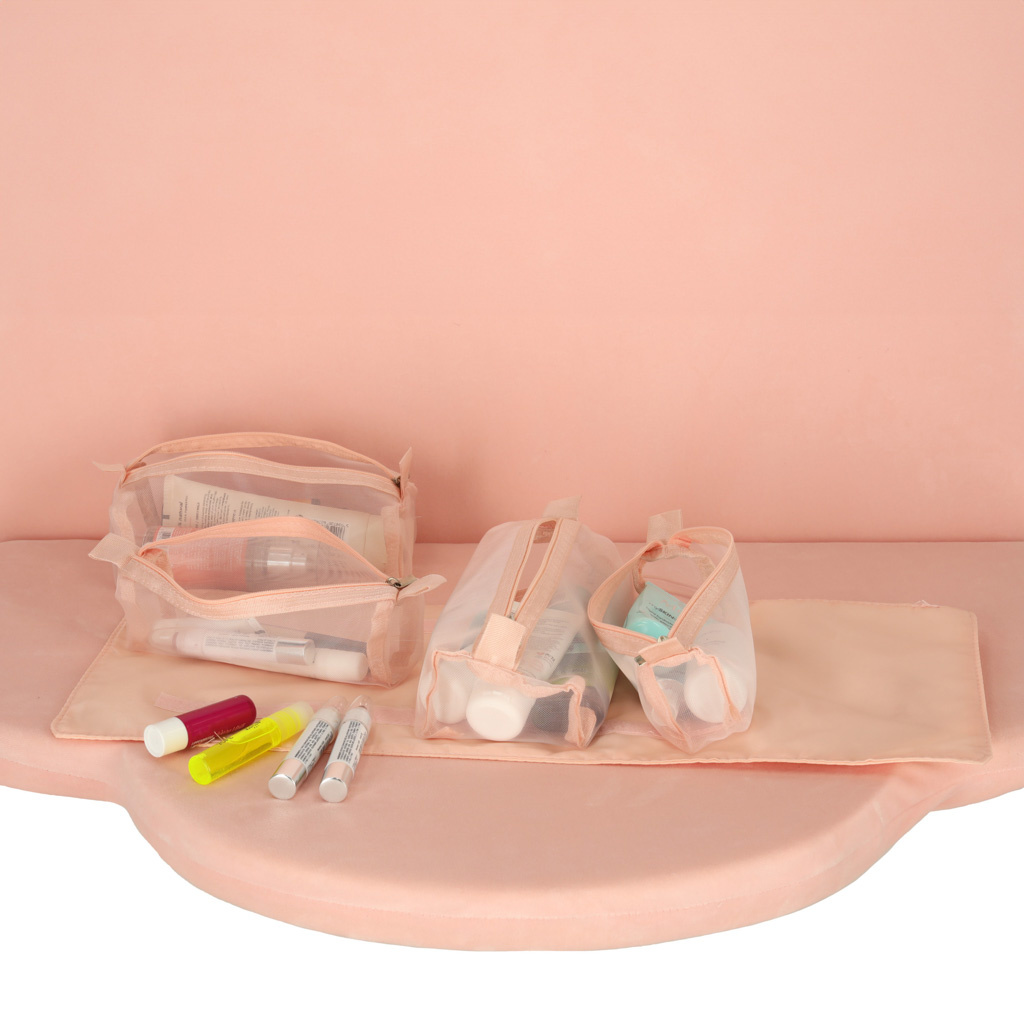 Ružová kozmetická taštička na cesty - možno zrolovať, aby v batožine zaberala menej miesta. Má štyri priehradky, ktoré možno vybrať. Steny priehradiek sú vyrobené zo sieťoviny, ktorá uľahčuje hľadanie výrobkov a tiež zabezpečuje dobré odvetrávanie mokrých obalov.