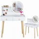 OPTIMÁLNE A PRAKTICKÉ POUŽITIE zásuvky, ideálne pre kozmetiku, šperky, účtenky, písacie potreby a všetky drobnosti, ktoré budú mať konečne svoje miesto, praktické police, do ktorých možno uložiť denne používané predmety, ako je krém na ruky, nádoba so štetcom na púder, parfum, vlasové doplnky, pracovná plocha, ktorá umožňuje používať toaletný stolík tiež ako písací stôl, zrkadlo s LED osvetlením, takže uvidíte presne svoje vlasy a make-up zo všetkých strán, praktický priestor pre vloženie stoličky