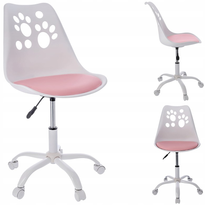 Stolička z kolekcie JOY Dokonale tvarované operadlo s motívom psích labiek v kombinácii s mäkkým vankúšom umiestneným na sedadle zaisťuje pohodlie, zatiaľ čo päťhviezdičková základňa zakončená malými kolieskami poskytuje skvelú stabilitu a chráni povrch pred poškriabaním. Stolička je vybavená pohonom, ktorý umožňuje nastaviť výšku sedadla podľa potreby.