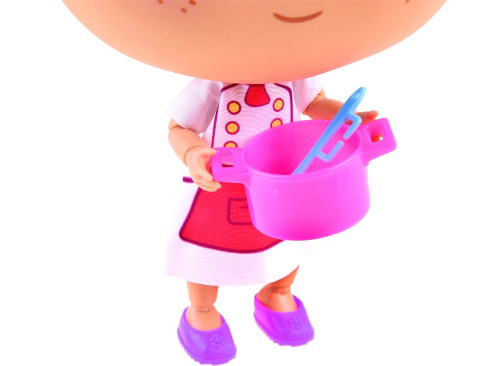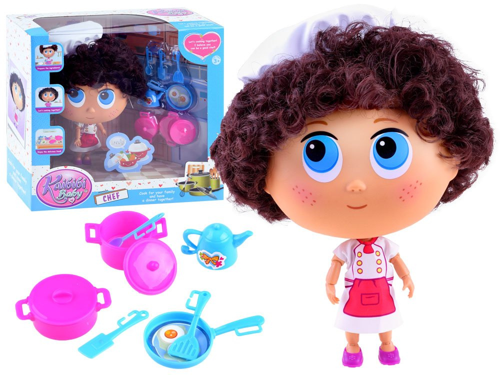 Úplne originálna bábika v kuchárskom oblečení je skvelý nápad. Bábika vyrobená výhradne z plastu s mega chlpatou, fantastickou hlavou. Bábika má všetky končatiny pohyblivé, ohýbateľné v kĺboch, zápästiach, lakťoch, kolenách, členkoch. Hlava sa otáča o 360 stupňov. Má na sebe kuchársku zásteru, ružové papuče a kuchársku čiapku. Má veľké oči, roztomilé pehy a úsmev na tvári. Má sadu hrncov, panvíc a kuchynského náčinia. S takouto bábikou bude každá hra čistým potešením.